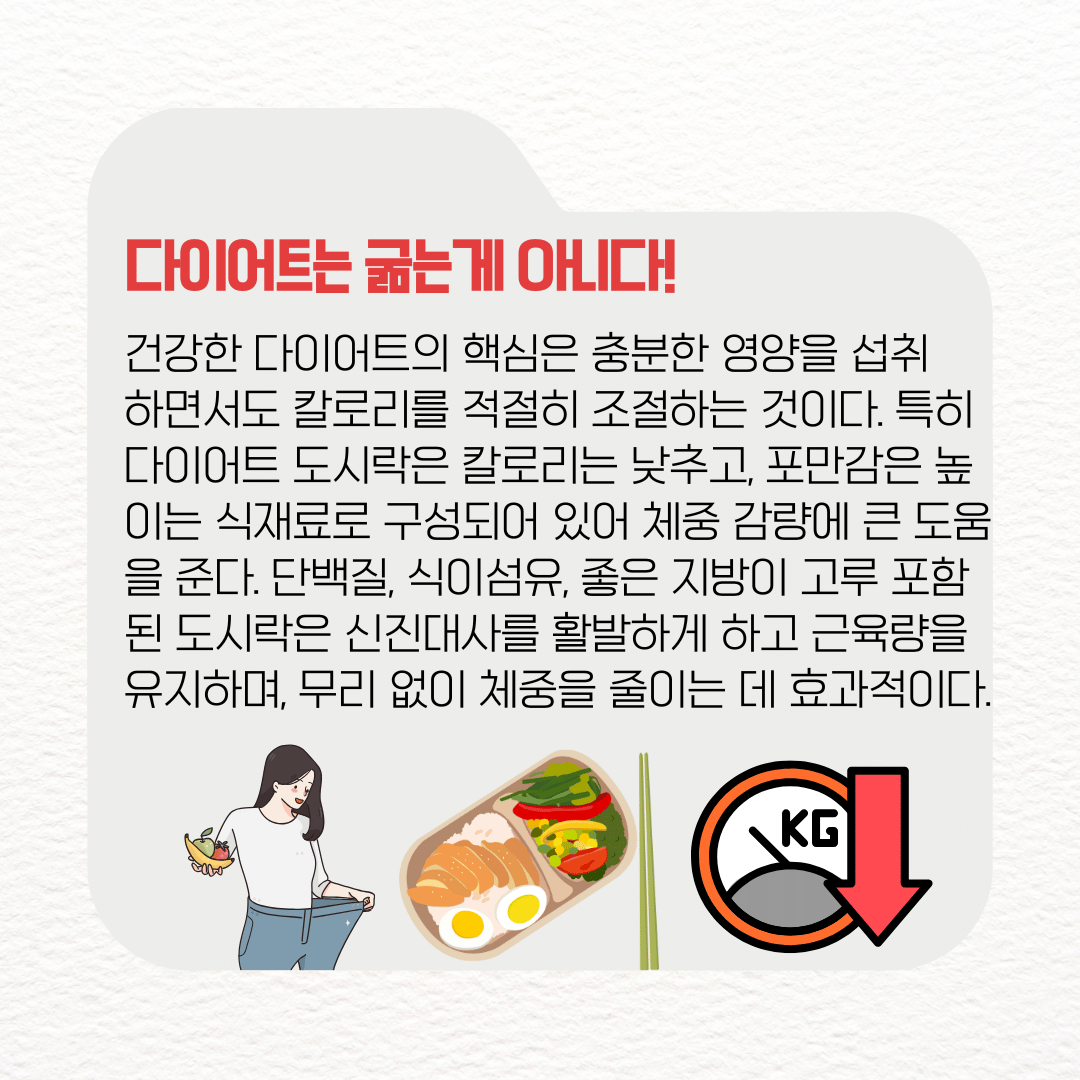이런 다양성은 식단 관리의 지속 가능성을 높여주며, ‘다이어트는 고통’이라는 인식을 바꿔주고있다. 매주 한 번씩 도시락 종류를 바꿔보거나, 식사 시간마다 다른 맛을 즐기면 스트레스 없이 건강한 식단을 유지할 수 있다.