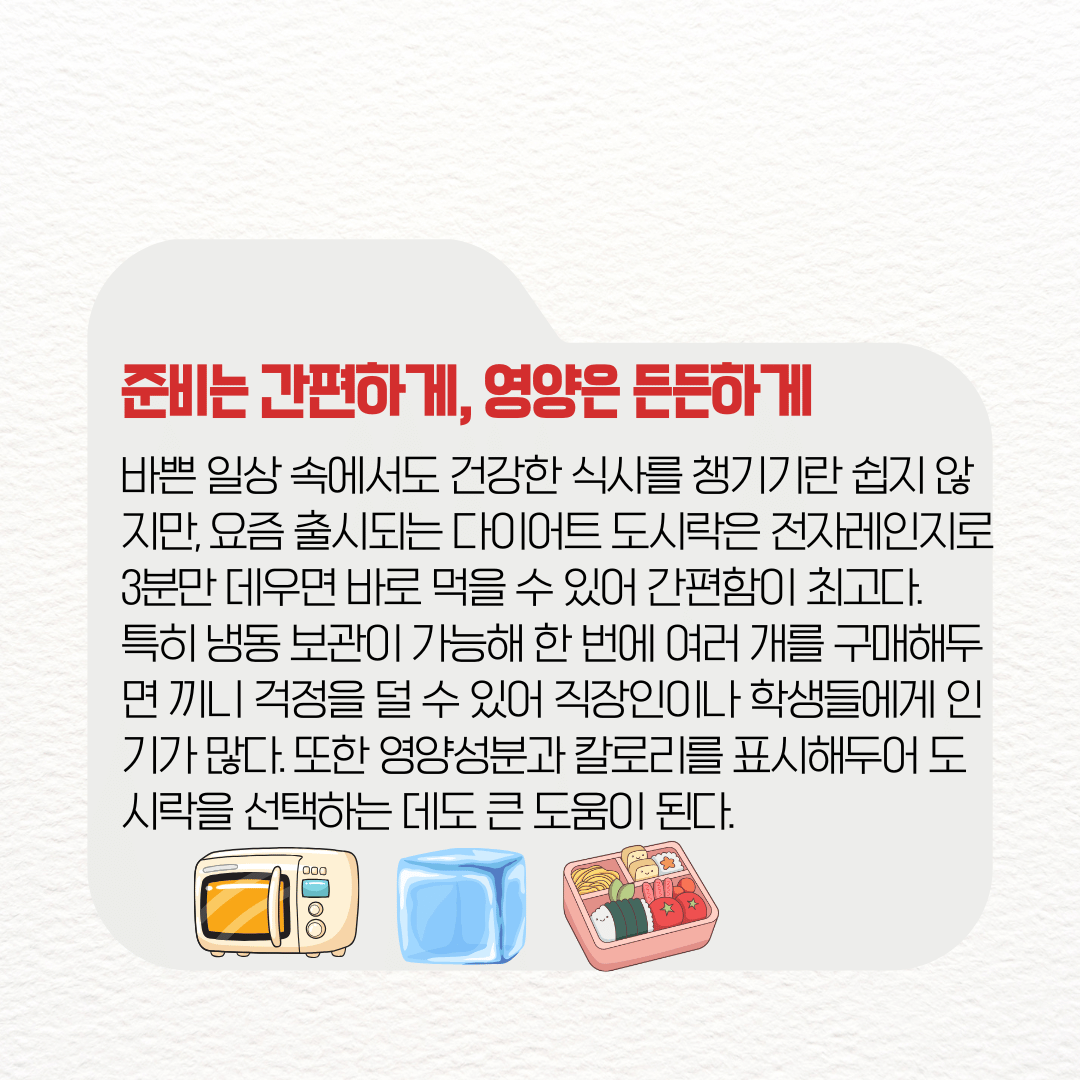 바쁜 현대인들에게 다이어트 도시락의 가장 큰 장점 중 하나는 ‘간편함’이다.