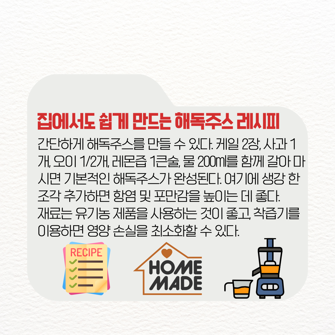 해독주스는 특별한 기구나 재료 없이도 집에서 손쉽게 만들 수 있다. 기본 레시피로는 케일 2장, 사과 1개, 오이 1/2개, 레몬즙 1큰술, 물 200ml를 넣고 믹서기에 곱게 갈아주면 된다.