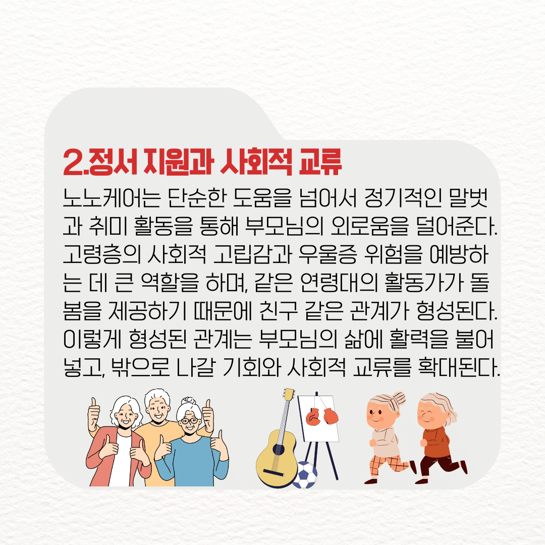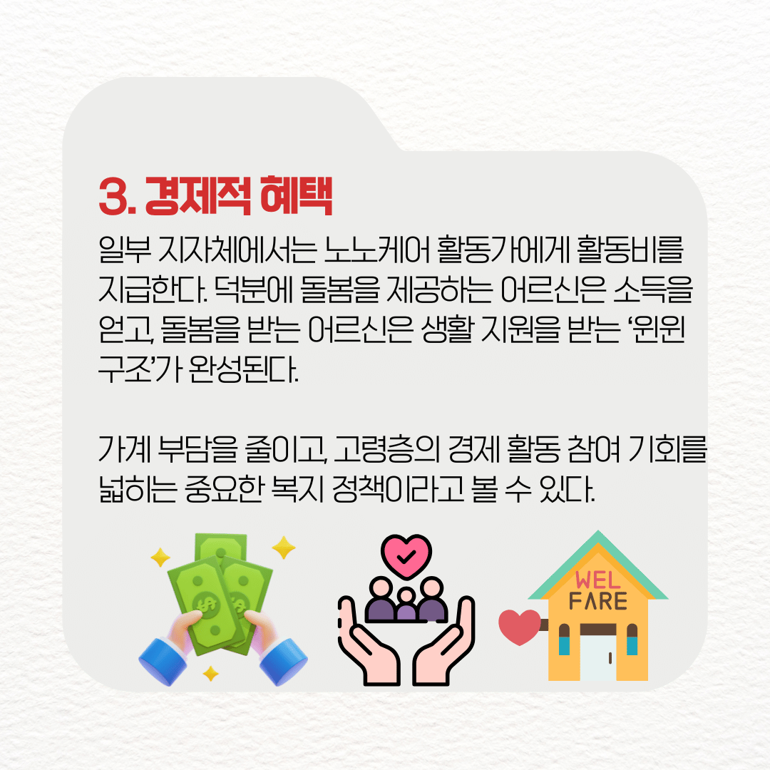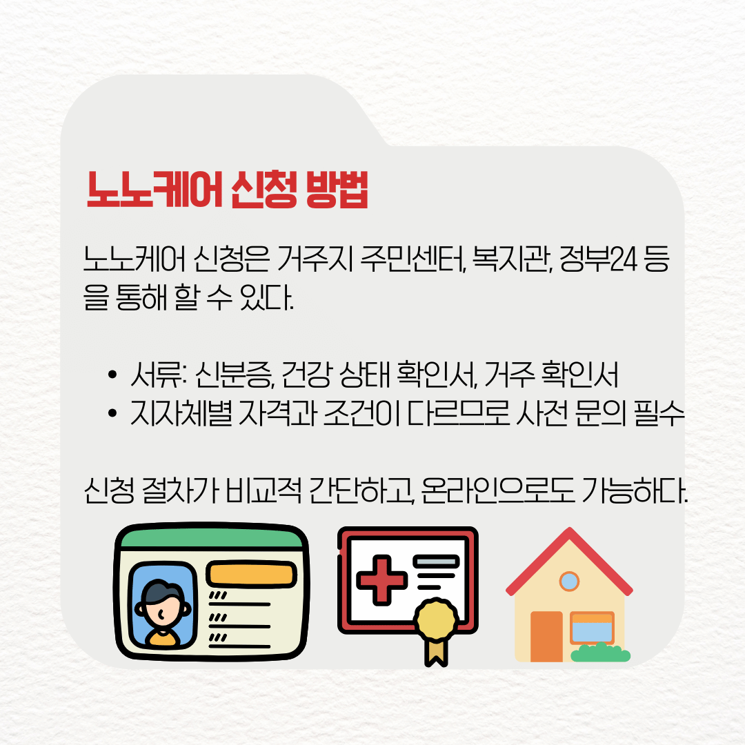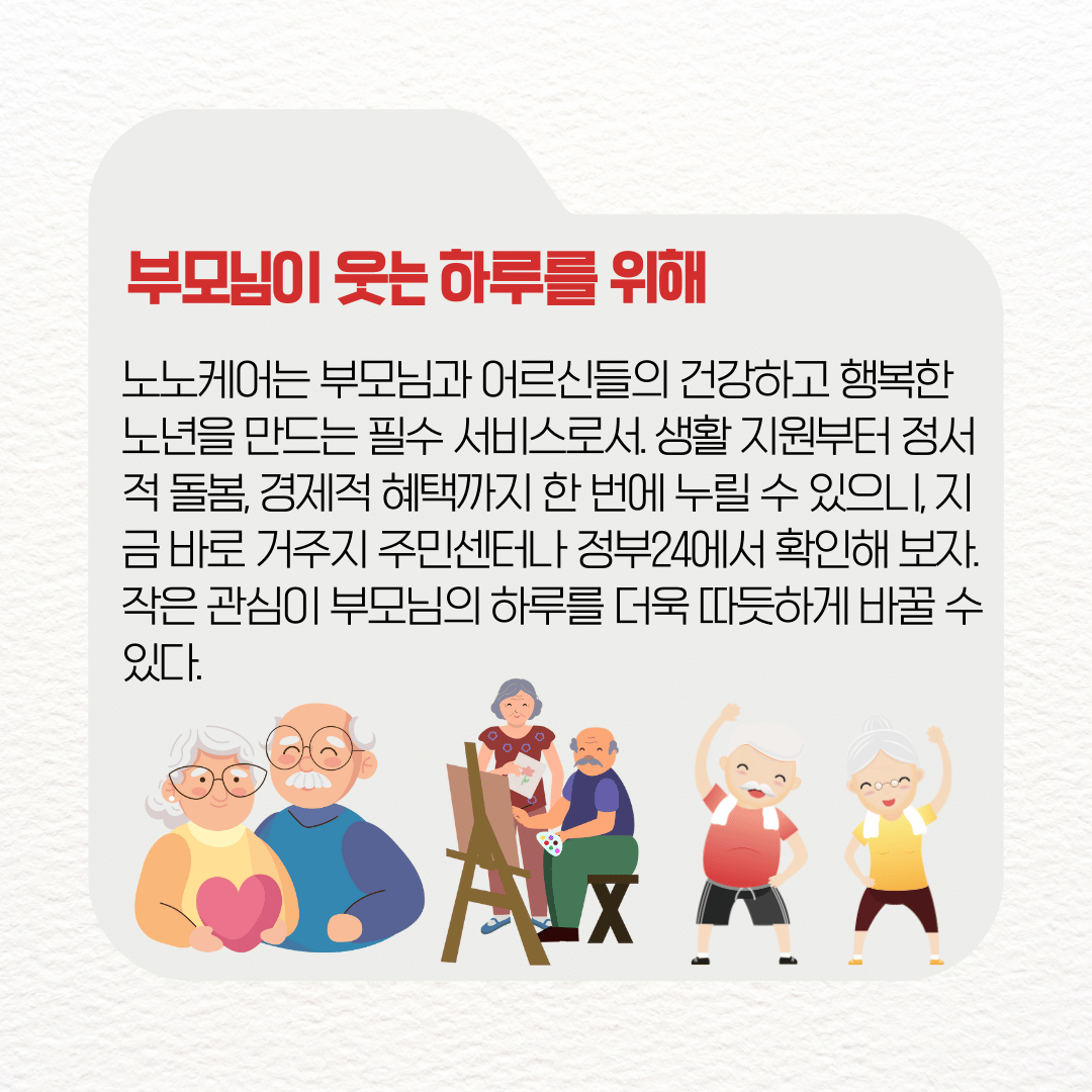 노노케어는 부모님과 어르신들의 건강하고 행복한 노년을 만드는 필수 서비스로서. 생활 지원부터 정서적 돌봄, 경제적 혜택까지 한 번에 누릴 수 있으니, 지금 바로 거주지 주민센터나 정부24에서 확인해 보자.