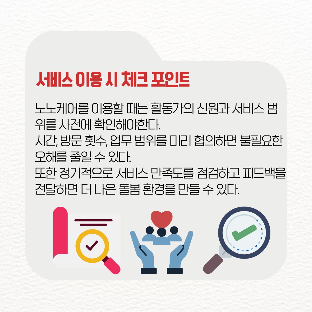 노노케어를 이용할 때는 활동가의 신원과 서비스 범위를 사전에 확인해야한다. 시간, 방문 횟수, 업무 범위를 미리 협의하면 불필요한 오해를 줄일 수 있다. 또한 정기적으로 서비스 만족도를 점검하고 피드백을 전달하면 더 나은 돌봄 환경을 만들 수 있다.