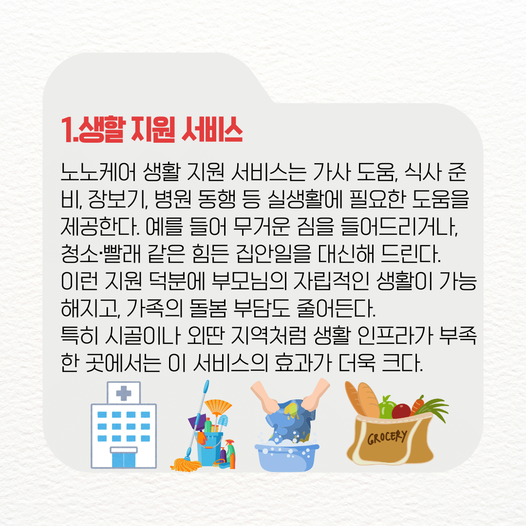 노노케어 생활 지원 서비스는 가사 도움, 식사 준비, 장보기, 병원 동행 등 실생활에 필요한 도움을 제공한다. 예를 들어 무거운 짐을 들어드리거나, 청소·빨래 같은 힘든 집안일을 대신해 드린다.