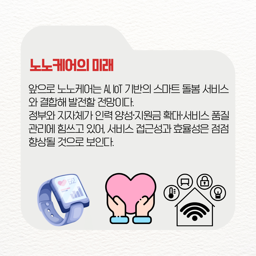 앞으로 노노케어는 AI, IoT 기반의 스마트 돌봄 서비스와 결합해 발전할 전망이다. 정부와 지자체가 인력 양성·지원금 확대·서비스 품질 관리에 힘쓰고 있어, 서비스 접근성과 효율성은 점점 향상될 것으로 보인다.