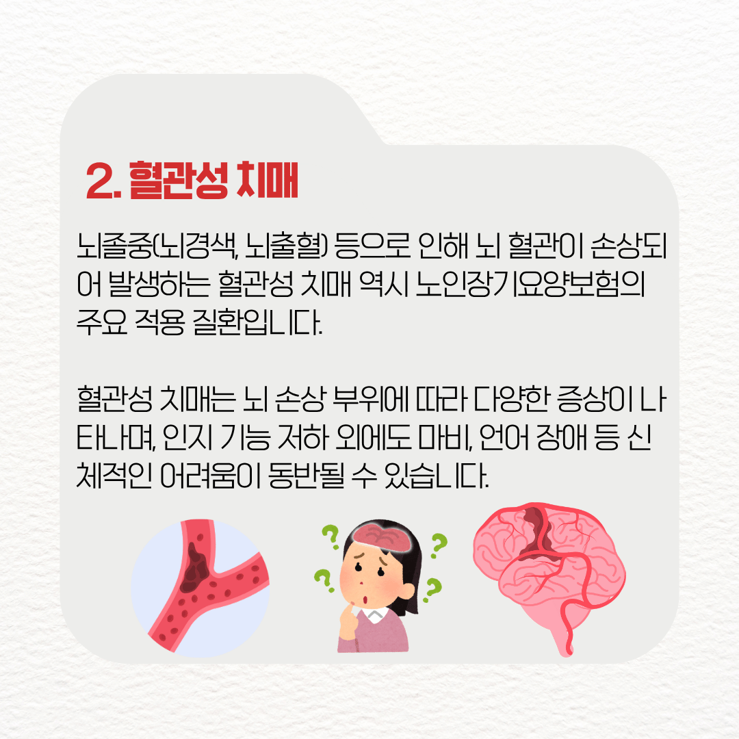 뇌졸중(뇌경색, 뇌출혈) 등으로 인해 뇌 혈관이 손상되어 발생하는 혈관성 치매 역시 노인장기요양보험의 주요 적용 질환입니다.