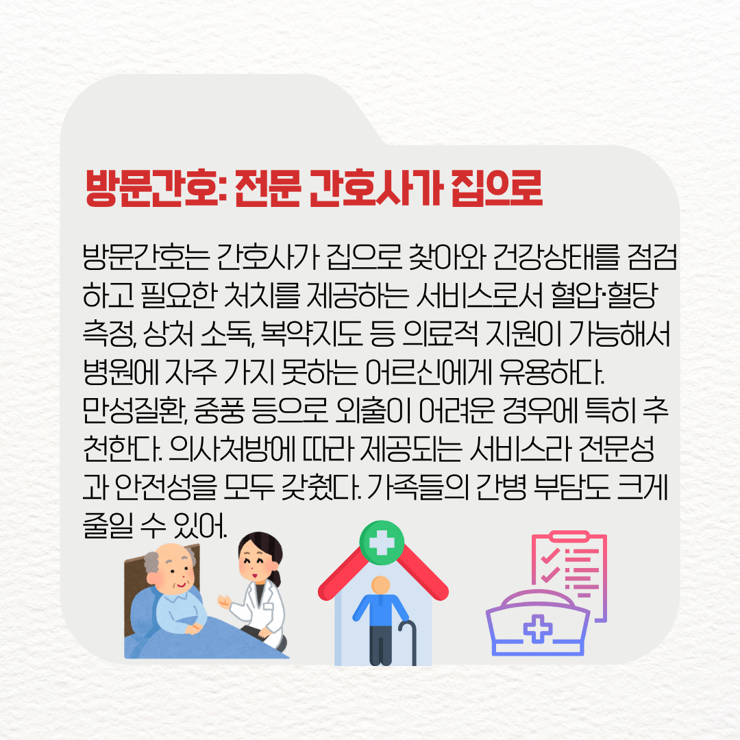 예를 들어 상처 소독이나 드레싱, 혈압·혈당 측정, 욕창 예방, 영양 관리 등이 가능하다. 특히 병원에 자주 가기 힘든 상황, 혹은 만성질환이나 중풍 등으로 외출이 어려운 어르신에게 정말 필요한 서비스라고 볼 수 있다.