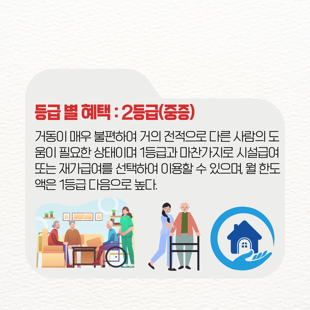 - 2등급 (중증): 거동이 매우 불편하여 거의 전적으로 다른 사람의 도움이 필요한 상태이며 1등급과 마찬가지로 시설급여 또는 재가급여를 선택하여 이용할 수 있으며, 월 한도액은 1등급 다음으로 높다.