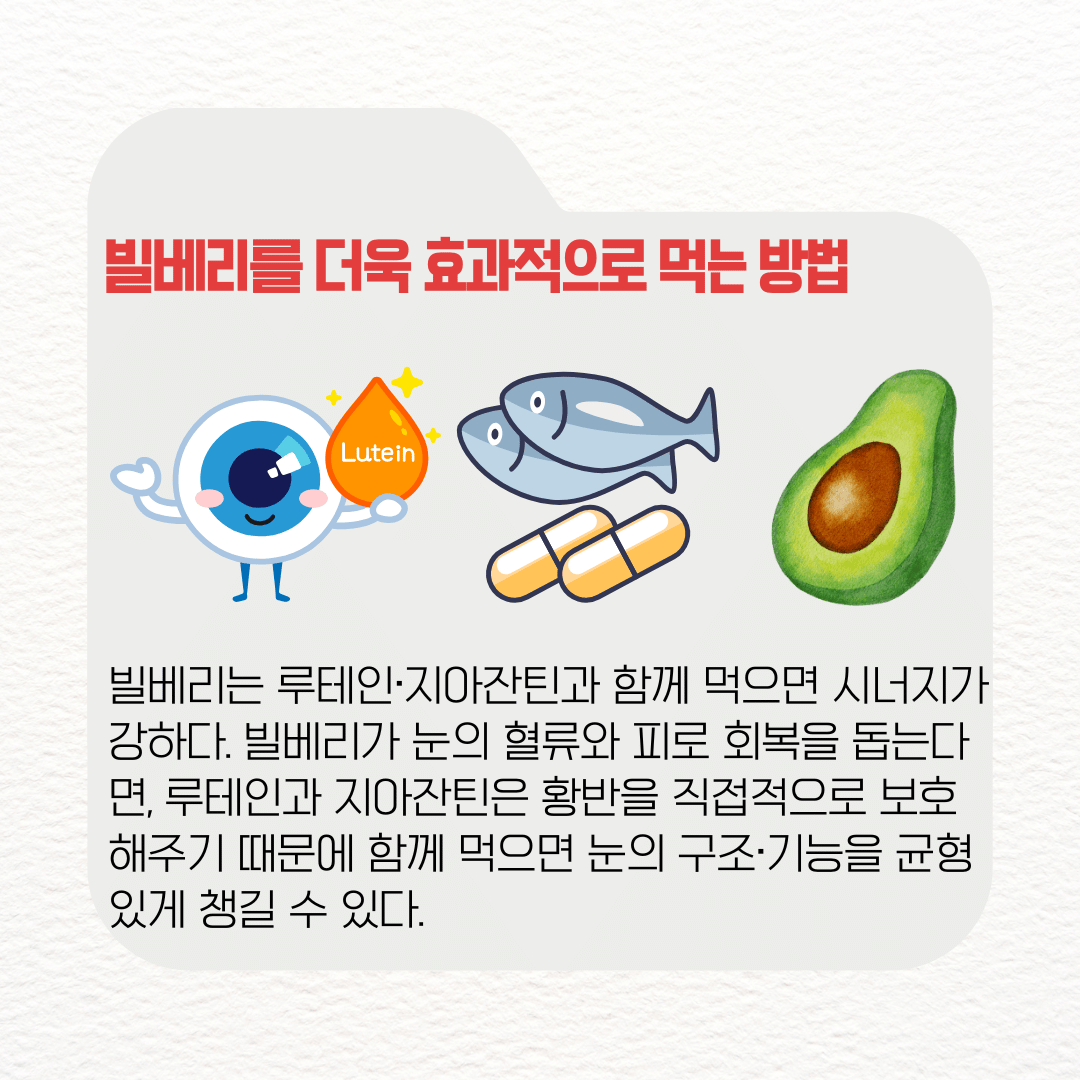빌베리는 루테인·지아잔틴과 함께 먹으면 시너지가 강하다. 빌베리가 눈의 혈류와 피로 회복을 돕는다면, 루테인과 지아잔틴은 황반을 직접적으로 보호해주기 때문에 함께 먹으면 눈의 구조·기능을 균형 있게 챙길 수 있다.