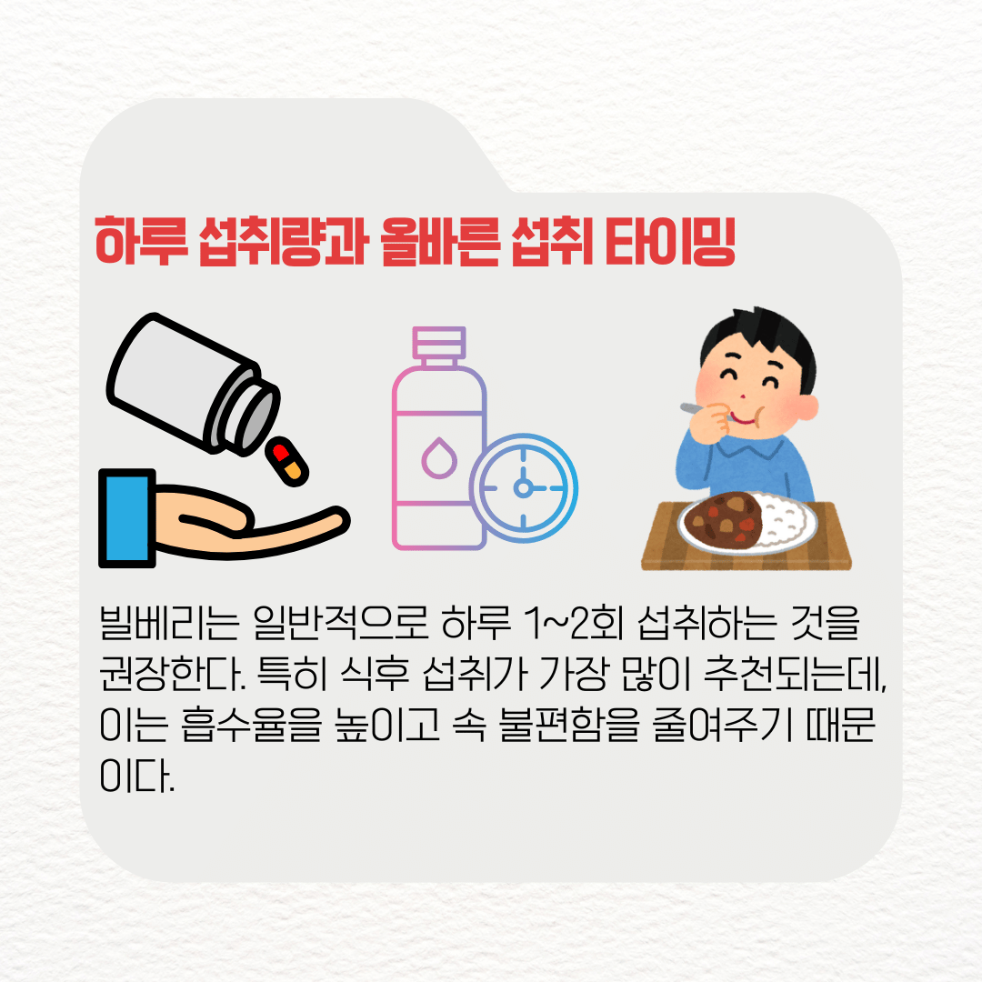 빌베리는 일반적으로 하루 1~2회 섭취하는 것을 권장한다. 특히 식후 섭취가 가장 많이 추천되는데, 이는 흡수율을 높이고 속 불편함을 줄여주기 때문이다.