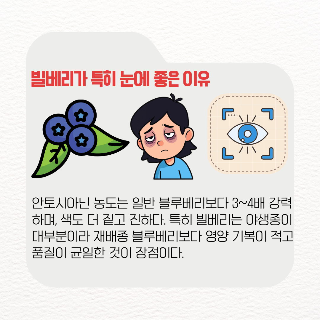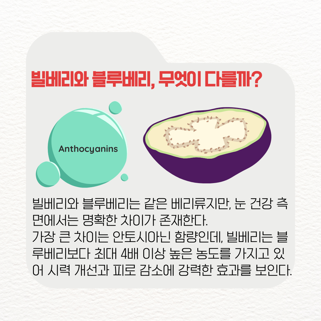 빌베리와 블루베리는 같은 베리류지만, 눈 건강 측면에서는 명확한 차이가 존재한다. 가장 큰 차이는 안토시아닌 함량인데, 빌베리는 블루베리보다 최대 4배 이상 높은 농도를 가지고 있어 시력 개선과 피로 감소에 더 강력한 효과를 보인다.