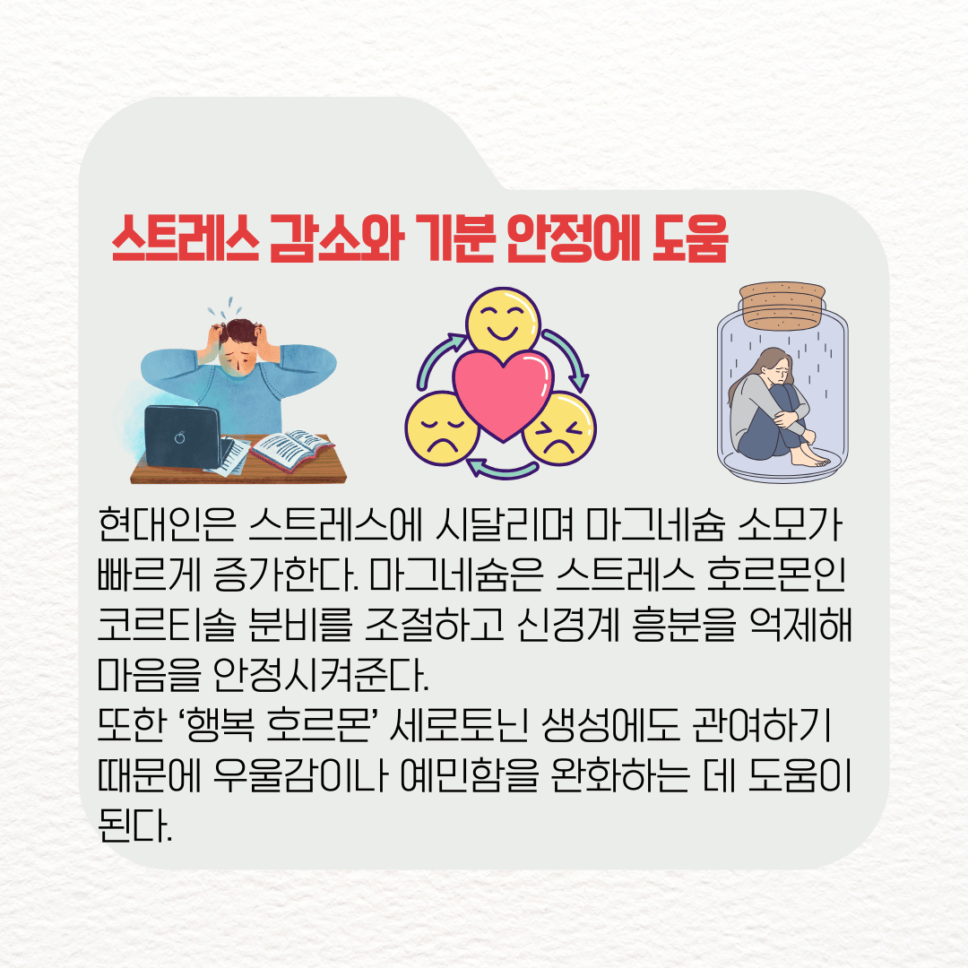 현대인은 스트레스에 시달리며 마그네슘 소모가 빠르게 증가한다. 마그네슘은 스트레스 호르몬인 코르티솔 분비를 조절하고 신경계 흥분을 억제해 마음을 안정시켜준다.