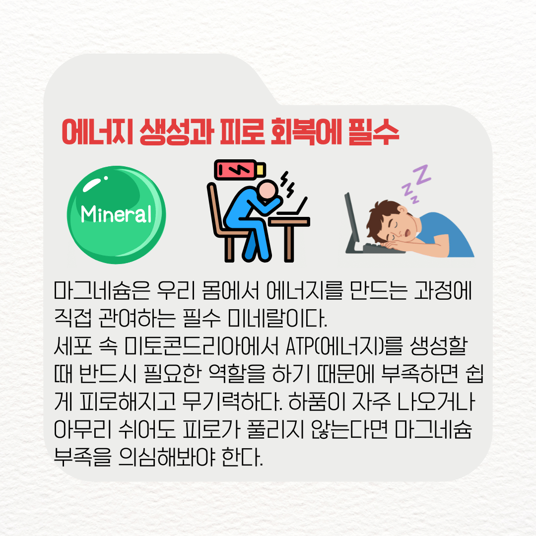 세포 속 미토콘드리아에서 ATP(에너지)를 생성할 때 반드시 필요한 역할을 하기 때문에 부족하면 쉽게 피로해지고 무기력하다. 하품이 자주 나오거나 아무리 쉬어도 피로가 풀리지 않는다면 마그네슘 부족을 의심해봐야 한다.