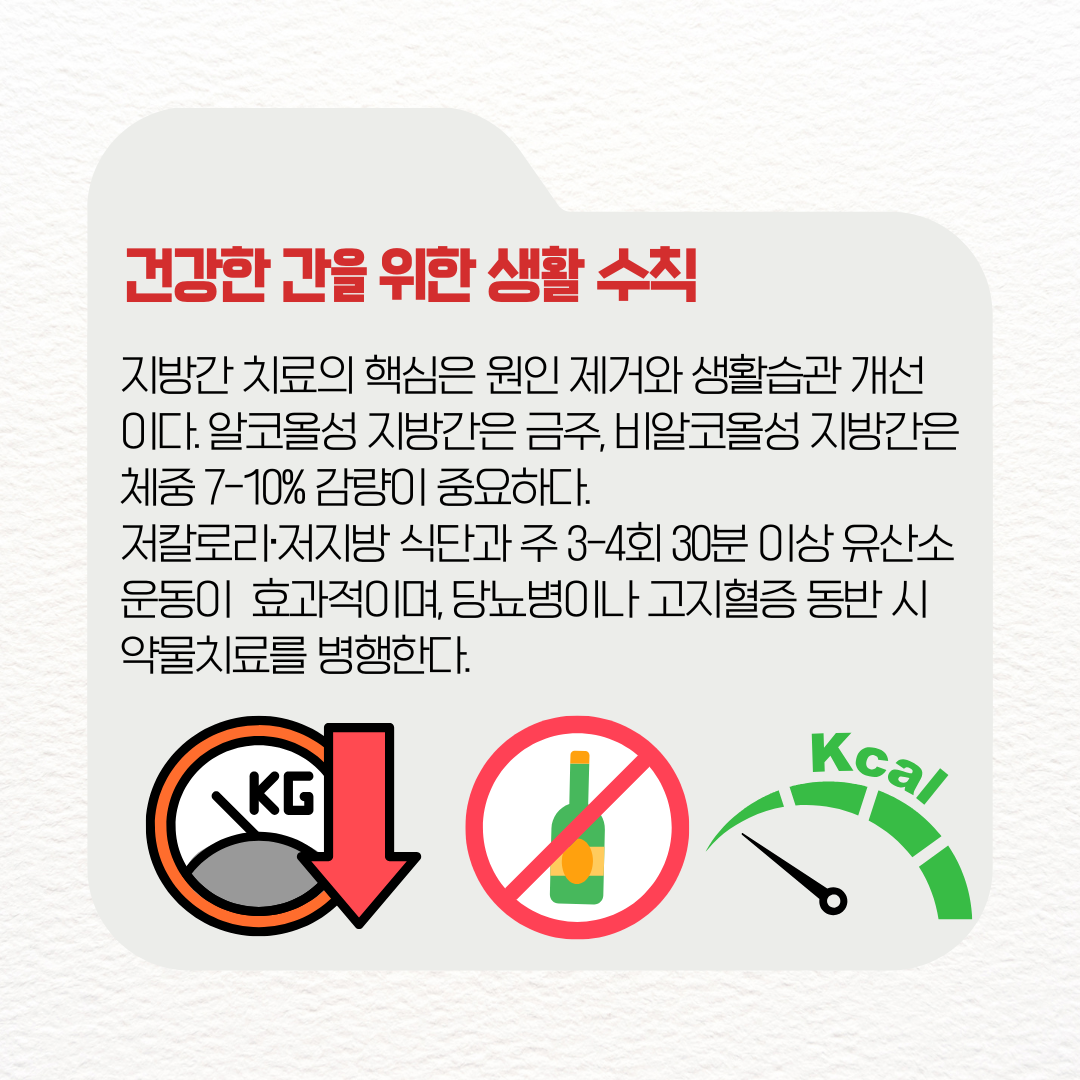 지방간 치료의 핵심은 원인 제거와 생활습관 개선이다. 알코올성 지방간의 경우 금주가 가장 중요하며, 비알코올성 지방간의 경우 체중 감량이 핵심이다. 체중의 7-10% 정도만 감량해도 간의 지방 축적을 크게 줄일 수 있다.