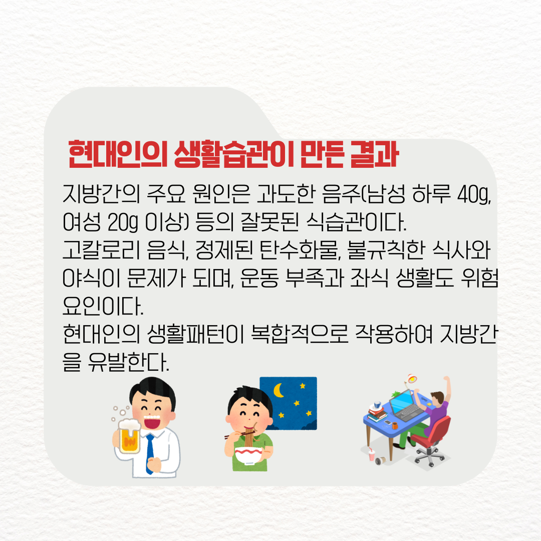 과거에는 알코올성 지방간이 주를 이뤘지만, 최근에는 서구화된 식습관, 운동 부족, 스트레스 증가 등으로 인해 비알코올성 지방간이 급격히 증가하고 있다.
