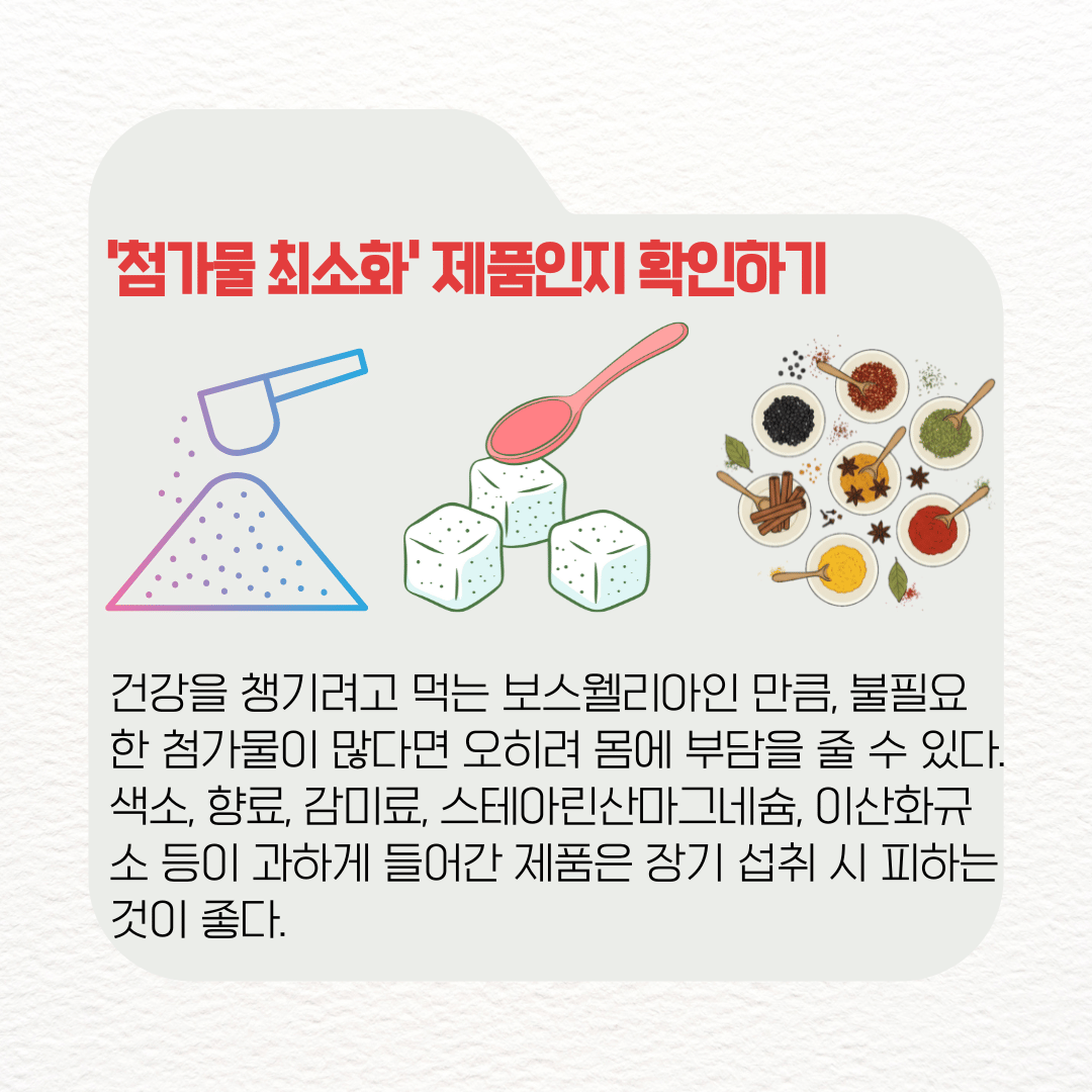 건강을 챙기려고 먹는 보스웰리아인 만큼, 불필요한 첨가물이 많다면 오히려 몸에 부담을 줄 수 있다. 색소, 향료, 감미료, 스테아린산마그네슘, 이산화규소 등이 과하게 들어간 제품은 장기 섭취 시 피하는 것이 좋다.