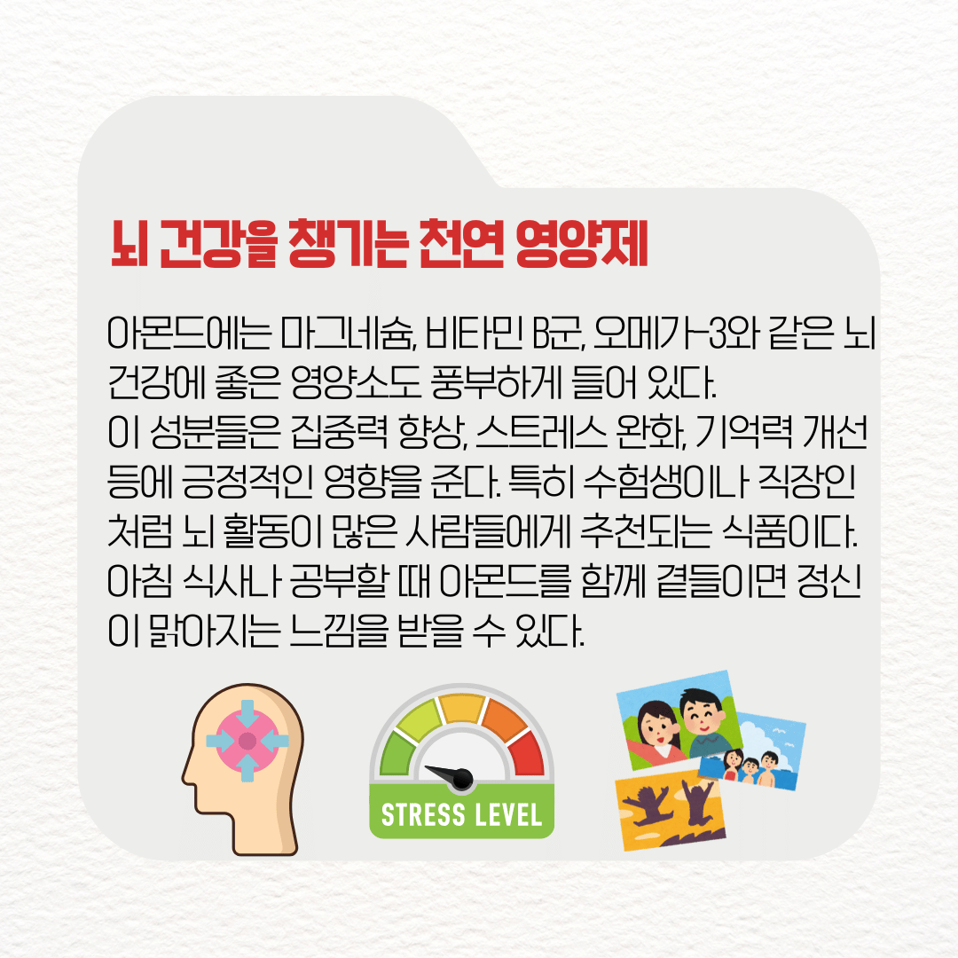 바쁜 일상 속에서 머리가 멍하거나 집중이 안 될 때, 뇌에 좋은 음식을 찾는다면 아몬드가 정답이다. 아몬드에는 비타민 B군, 마그네슘, 오메가-3 지방산 등 뇌 기능을 활성화하는 성분들이 골고루 들어 있다.