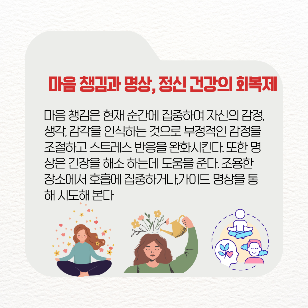 하루 10~15분씩 조용한 장소에서 앉아 호흡에 집중하거나, 가이드 명상을 들으며 천천히 감정을 내려놓는 습관을 들이면 마음이 한결 편안해지고 삶의 질도 향상된다.