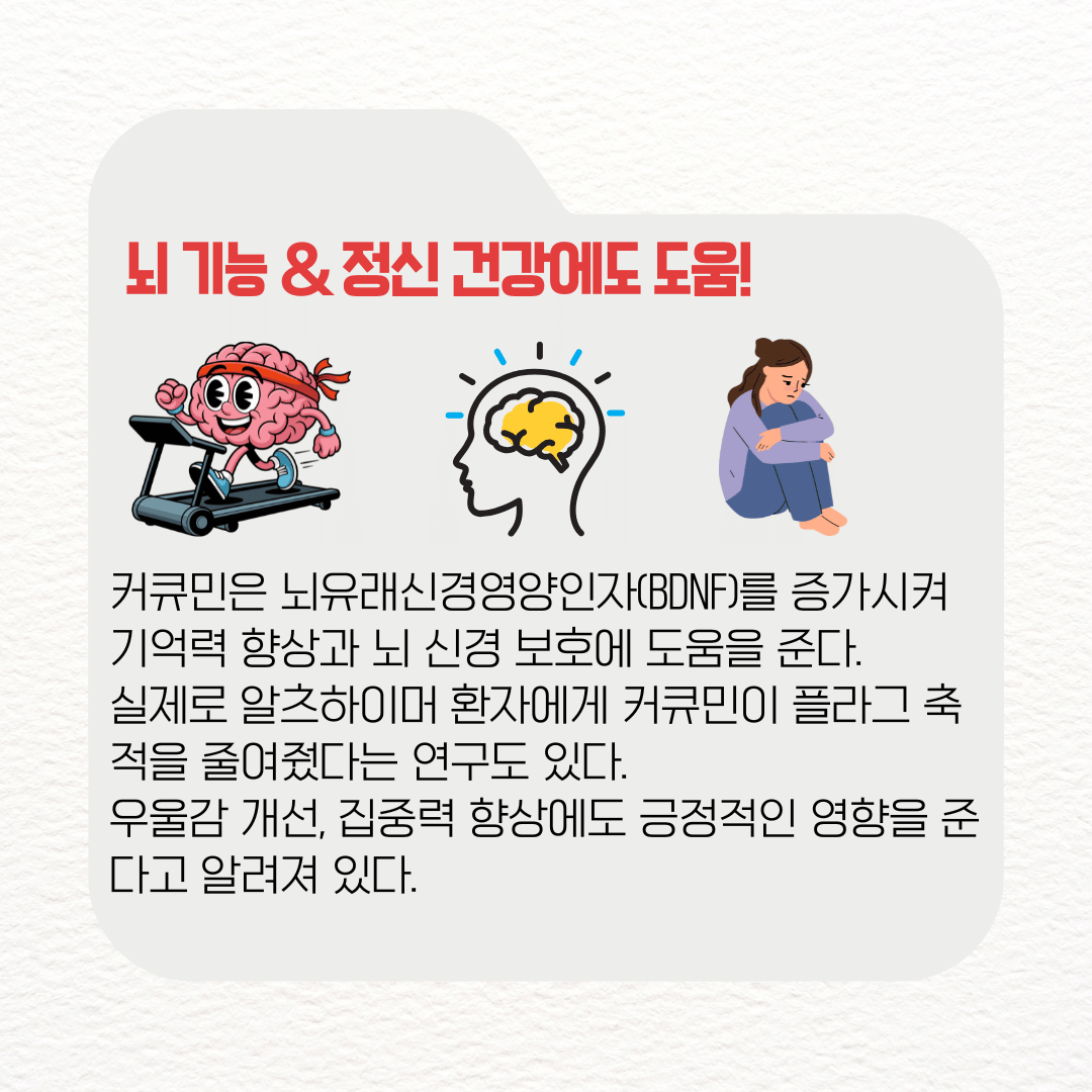 커큐민은 뇌유래신경영양인자(BDNF)를 증가시켜 기억력 향상과 뇌 신경 보호에 도움을 준다. 실제로 알츠하이머 환자에게 커큐민이 플라그 축적을 줄여줬다는 연구도 있다. 우울감 개선, 집중력 향상에도 긍정적인 영향을 준다고 알려져 있다.