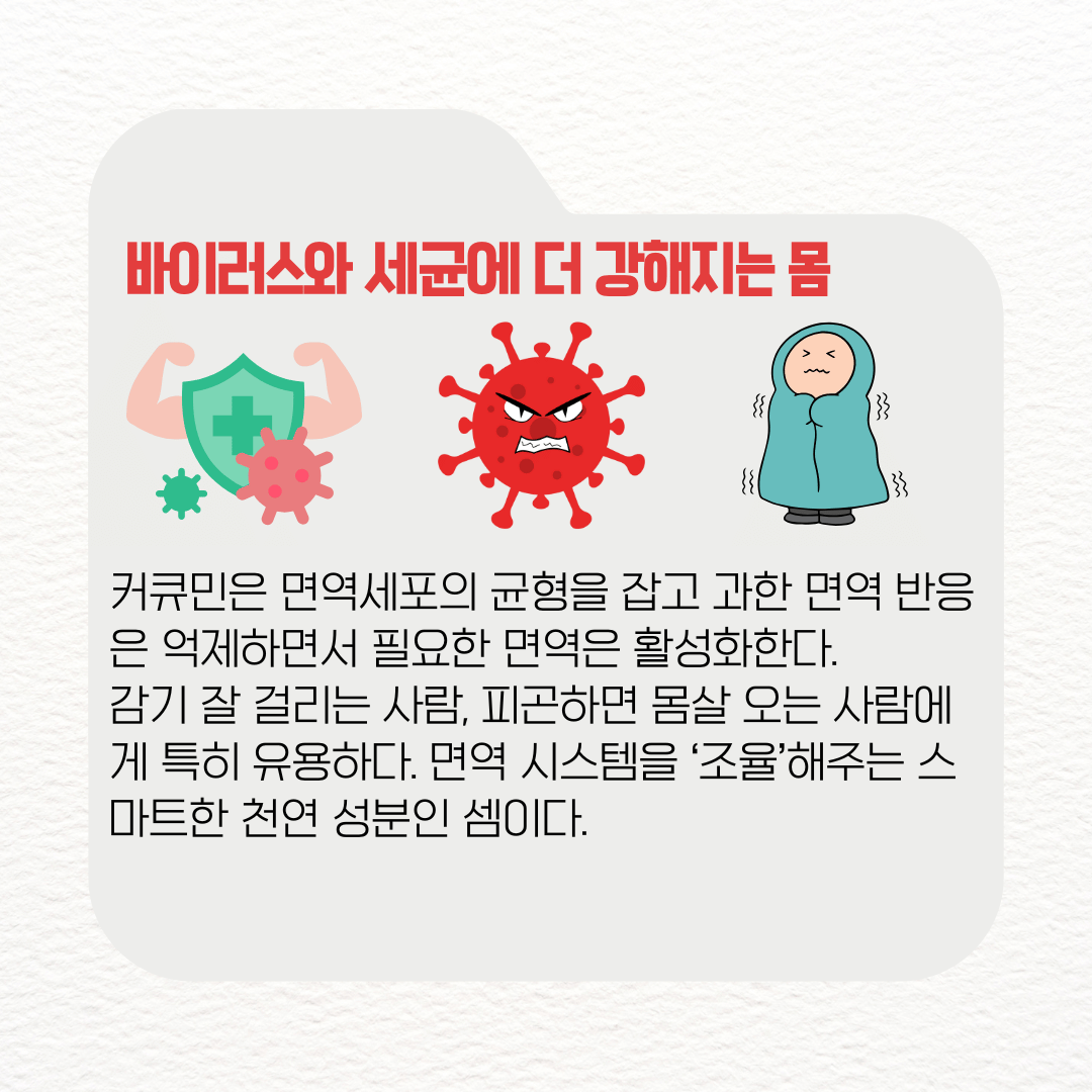 커큐민은 면역세포의 균형을 잡고 과한 면역 반응은 억제하면서 필요한 면역은 활성화한다. 감기 잘 걸리는 사람, 피곤하면 몸살 오는 사람에게 특히 유용하다. 면역 시스템을 ‘조율’해주는 스마트한 천연 성분인 셈이다.