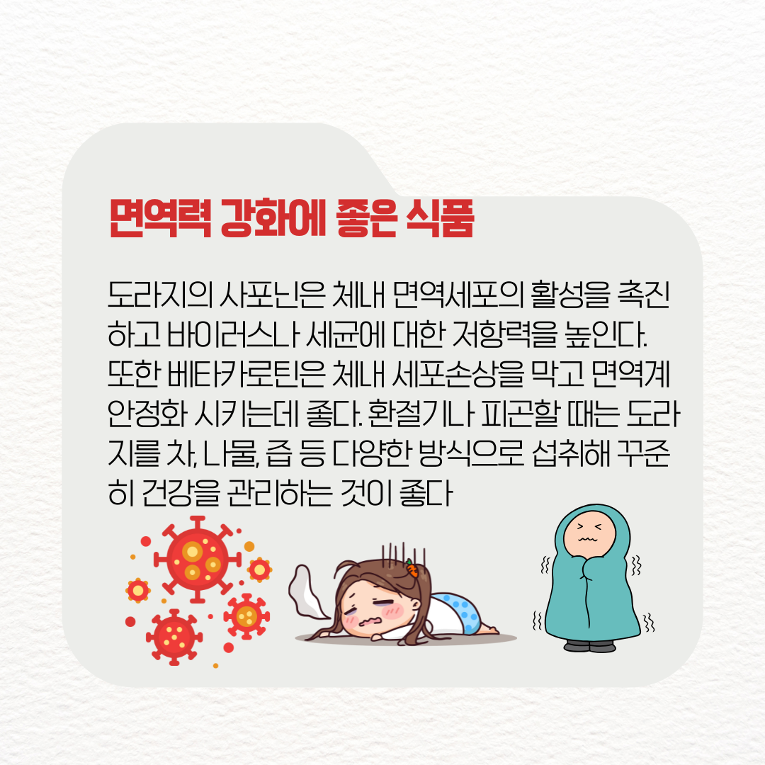 도라지는 사포닌, 베타카로틴, 무기질, 식이섬유 등 면역력 향상에 도움이 되는 성분이 풍부하게 함유된 식품이다.