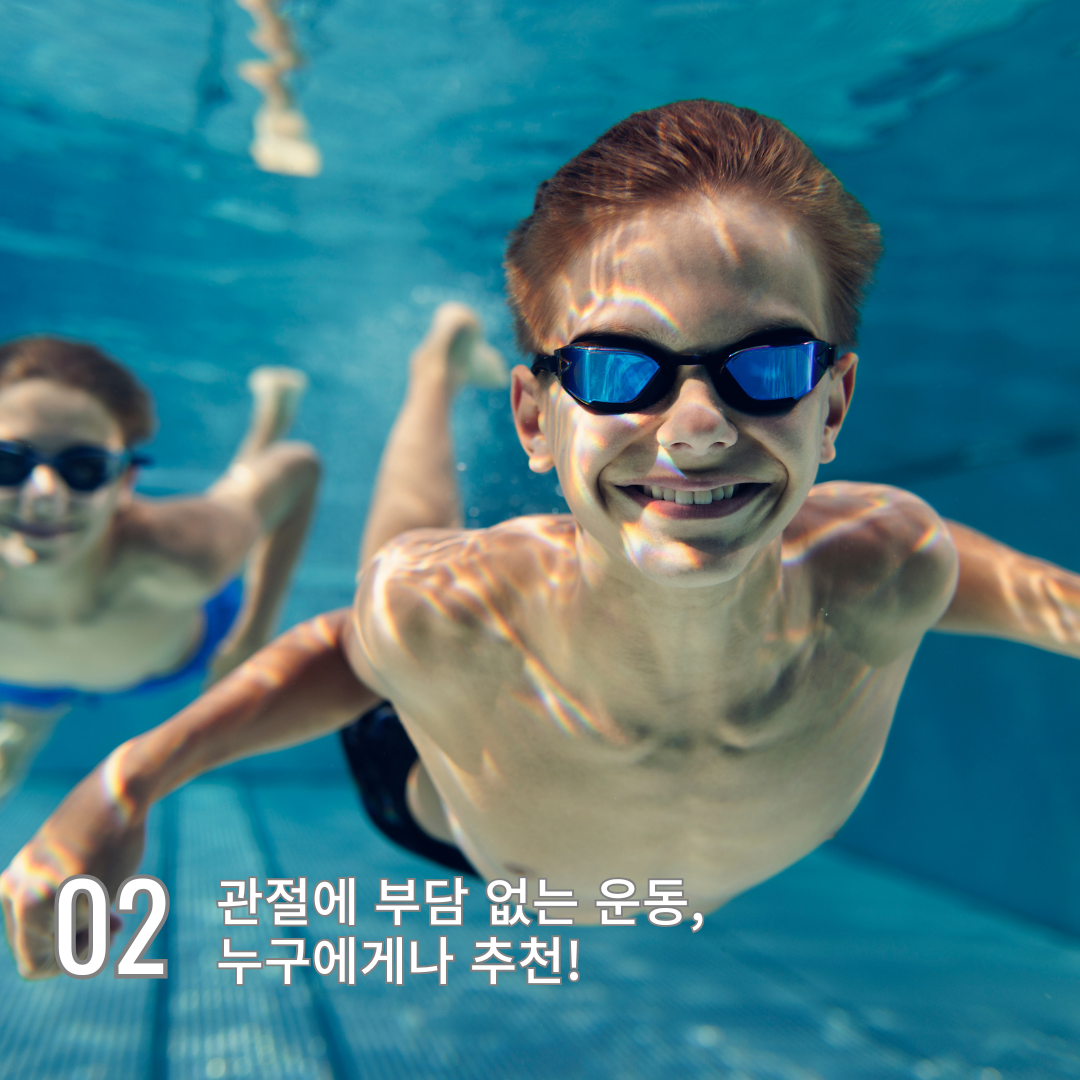 물의 부력 덕분에 수영은 관절에 가해지는 압력이 현저히 줄어들어, 관절염이나 허리 디스크 등으로 고생하는 사람도 부담 없이 즐길 수 있는 운동이다.