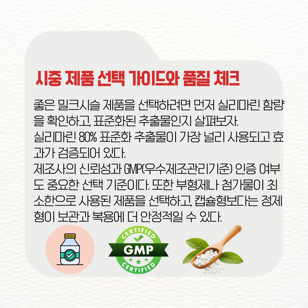 좋은 밀크시슬 제품을 선택하려면 몇 가지 핵심 요소를 확인해야 한다. 먼저 실리마린 함량을 확인하고, 표준화된 추출물인지 살펴보자. 일반적으로 실리마린 80% 표준화 추출물이 가장 널리 사용되고 효과가 검증되어 있다.