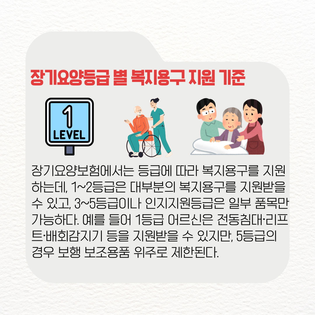 예를 들어 1등급 어르신은 전동침대·리프트·배회감지기 등을 지원받을 수 있지만, 5등급의 경우 보행 보조용품 위주로 제한된다.