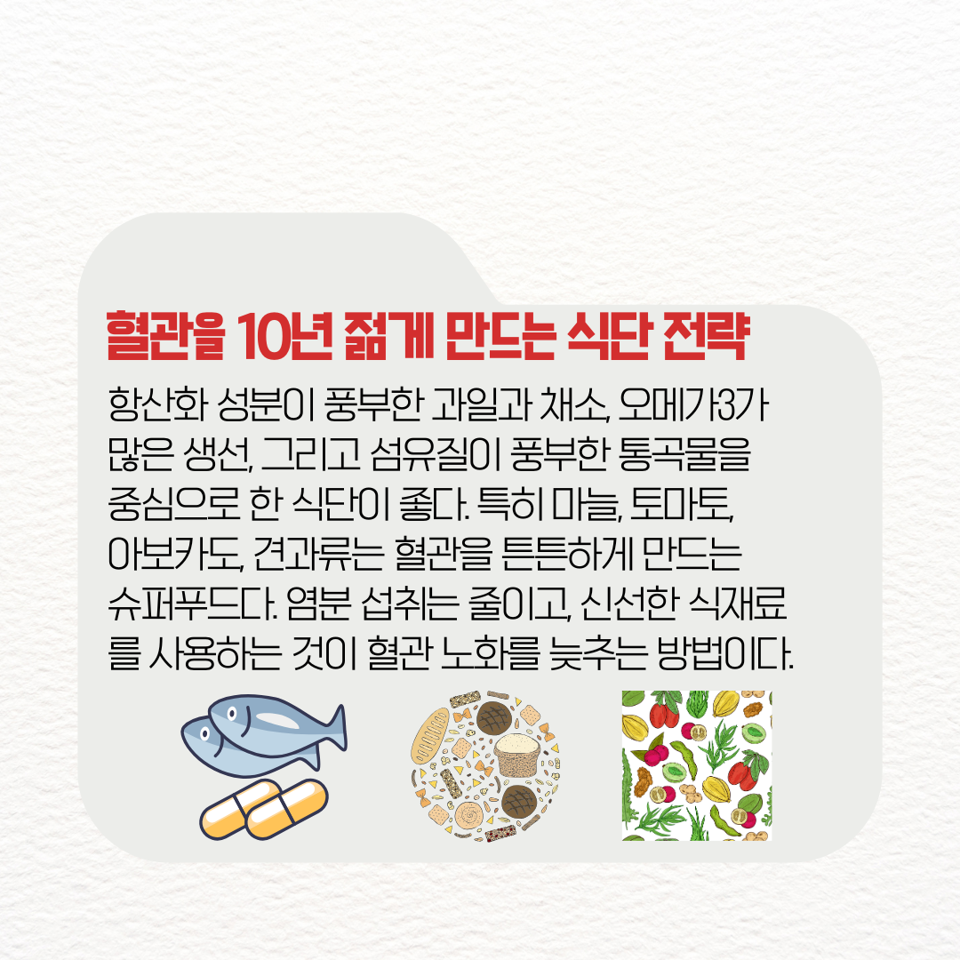 여기에 신선한 채소와 과일을 충분히 섭취하면 항산화 효과까지 더해져 혈관을 10년 이상 젊게 유지할 수 있다. 가공식품, 설탕, 소금 섭취는 줄이고, 물을 자주 마시는 습관도 혈액 순환에 도움이 됩니다.