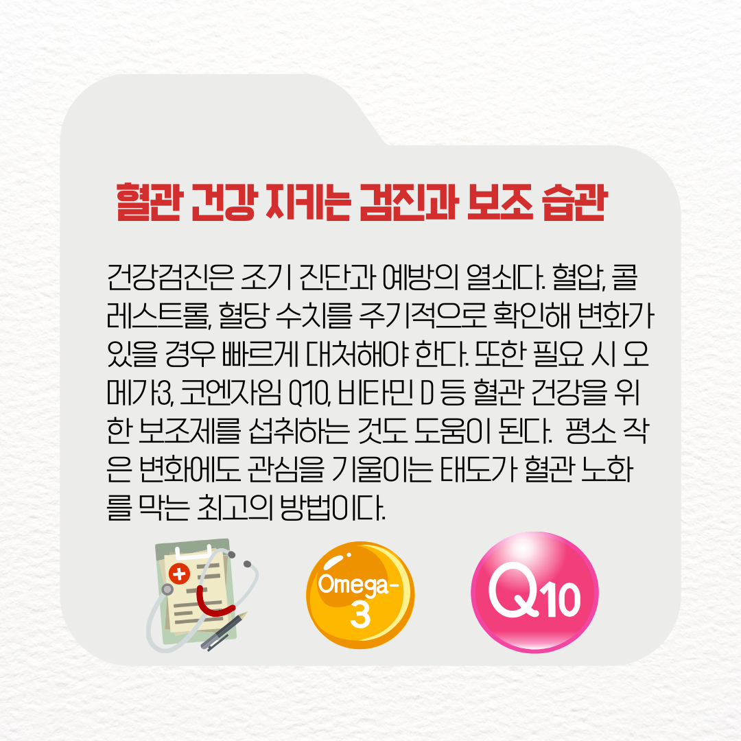 이러한 요인들이 복합적으로 작용하면 눈에 띄는 증상 없이도 혈관 노화는 빠르게 진행된다. 따라서 일상 속 습관을 점검하고, 가능한 원인을 줄이는 것이 건강한 혈관을 유지하는 핵심이다.