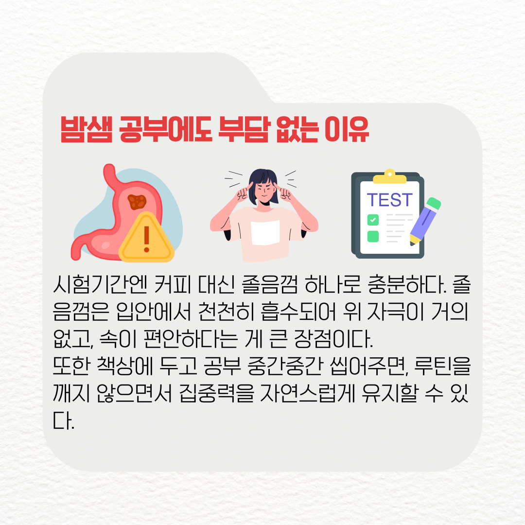 시험기간엔 커피 대신 졸음껌 하나로 충분하다. 커피는 마실 때는 좋지만, 카페인 내성이 쌓이거나 위가 쓰릴 수 있다. 반면 졸음껌은 입안에서 천천히 흡수되어 위 자극이 거의 없고, 속이 편안하다는 게 큰 장점이다.