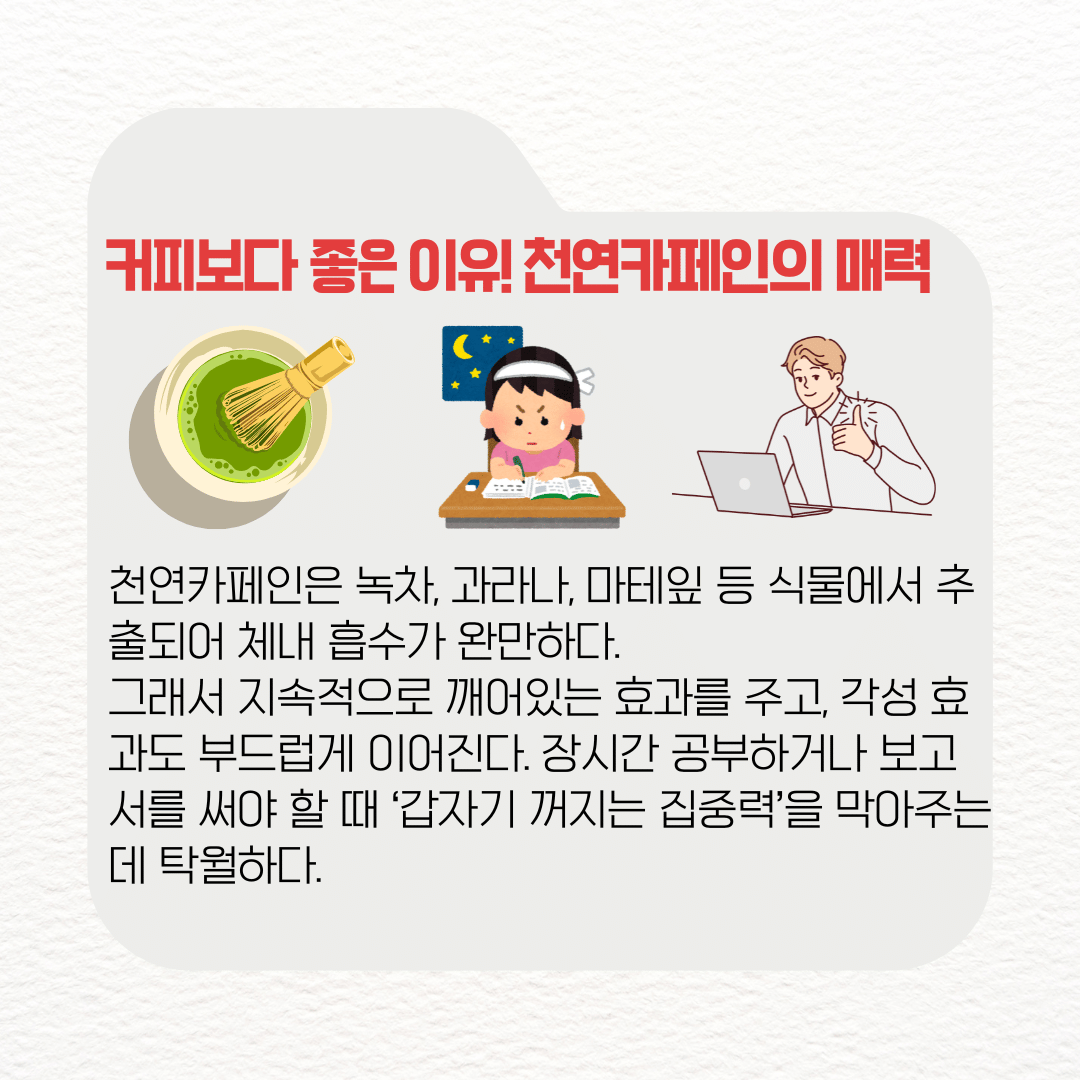 일반 카페인은 혈당을 급격히 올리고, 심장을 두근거리게 만들어서 오히려 피로감을 높일 때가 있다. 반면 천연카페인은 녹차, 과라나, 마테잎 등 식물에서 추출되어 체내 흡수가 완만하다.