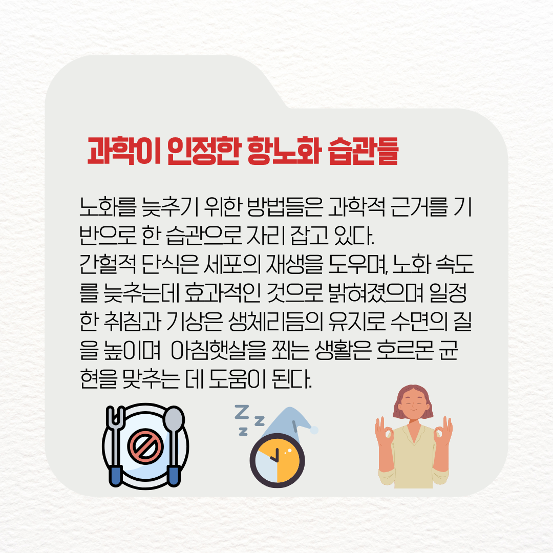 노화를 늦추기 위한 방법들은 이제 막연한 민간요법이 아닌, 과학적 근거를 기반으로 한 구체적인 습관으로 자리 잡고 있다.