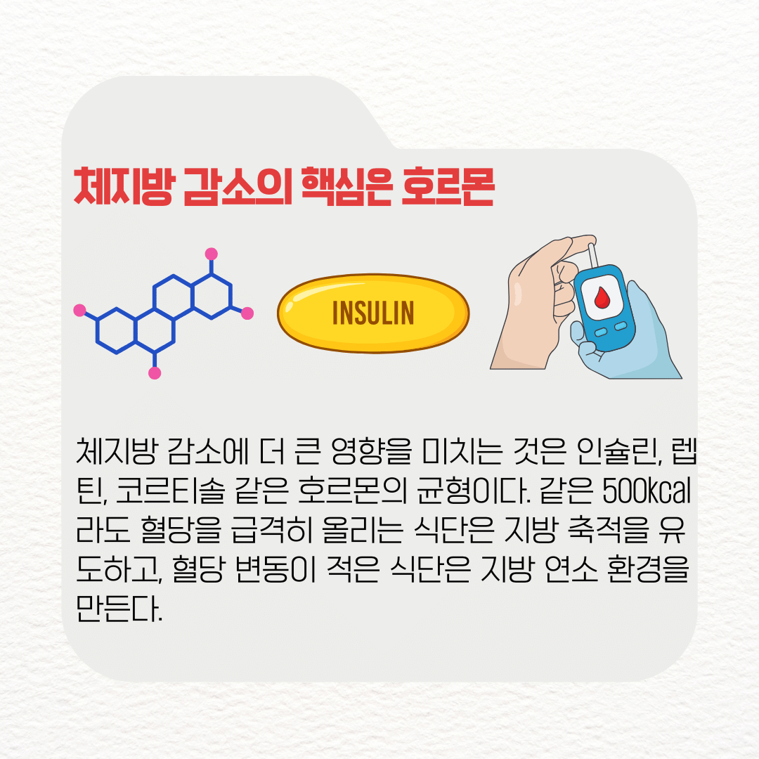 많은 사람들이 다이어트를 칼로리 계산으로만 접근하지만, 체지방 감소에 더 큰 영향을 미치는 것은 인슐린, 렙틴, 코르티솔 같은 호르몬의 균형이다.