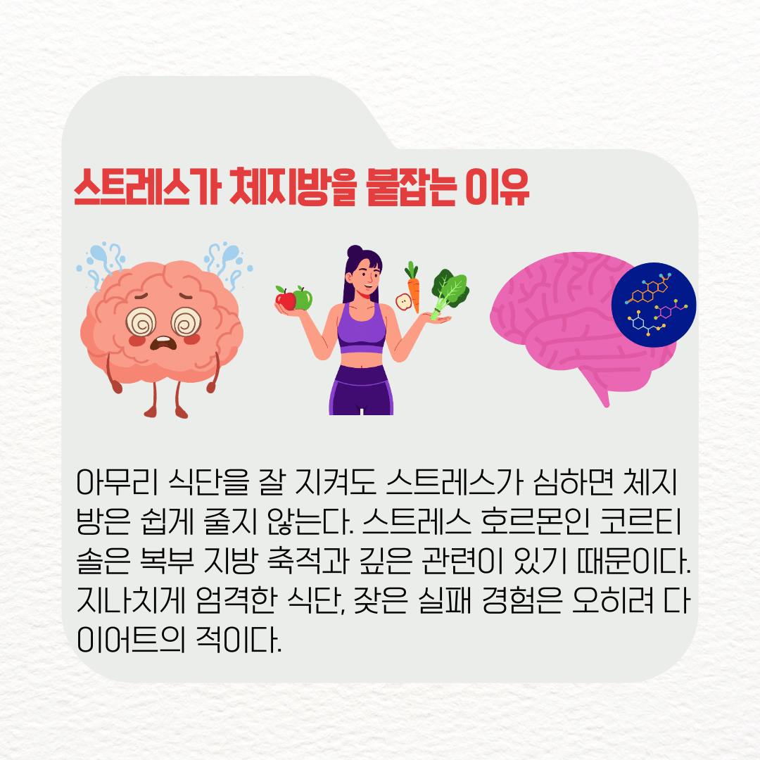 아무리 식단을 잘 지켜도 스트레스가 심하면 체지방은 쉽게 줄지 않는다. 스트레스 호르몬인 코르티솔은 복부 지방 축적과 깊은 관련이 있기 때문이다. 지나치게 엄격한 식단, 잦은 실패 경험은 오히려 다이어트의 적이다.