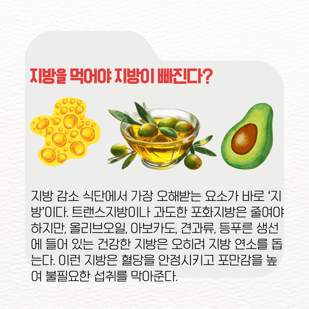 이런 지방은 혈당을 안정시키고 포만감을 높여 불필요한 섭취를 막아준다. 지방을 무조건 피하는 식단은 오래 지속되기 어렵다.