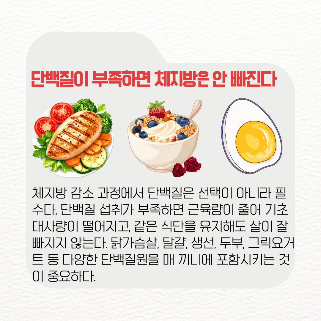체지방 감소 과정에서 단백질은 선택이 아니라 필수다. 단백질 섭취가 부족하면 근육량이 줄어 기초대사량이 떨어지고, 같은 식단을 유지해도 살이 잘 빠지지 않는다.
