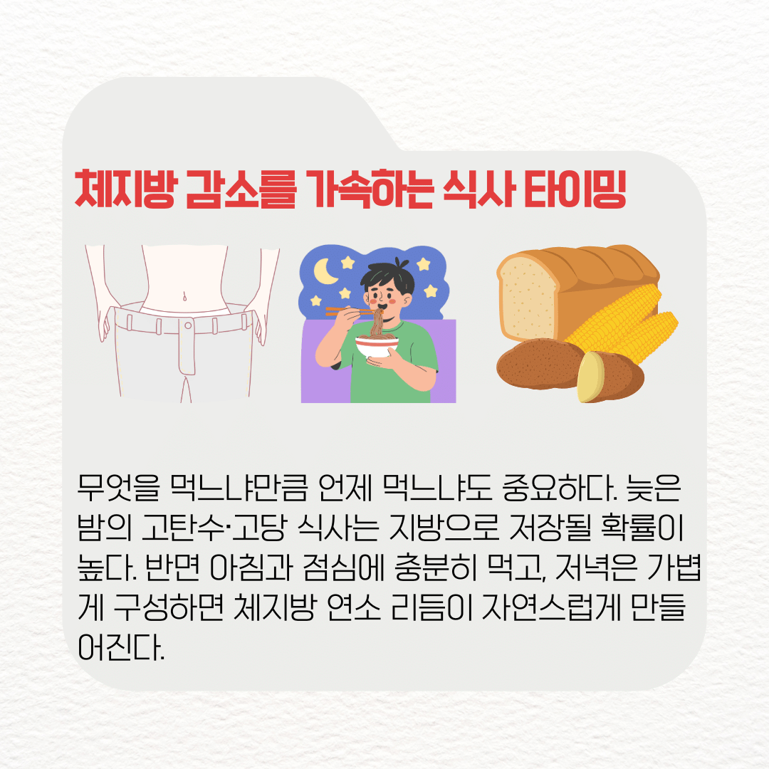 무엇을 먹느냐만큼 언제 먹느냐도 중요하다. 늦은 밤의 고탄수·고당 식사는 지방으로 저장될 확률이 높다. 반면 아침과 점심에 충분히 먹고, 저녁은 가볍게 구성하면 체지방 연소 리듬이 자연스럽게 만들어진다.