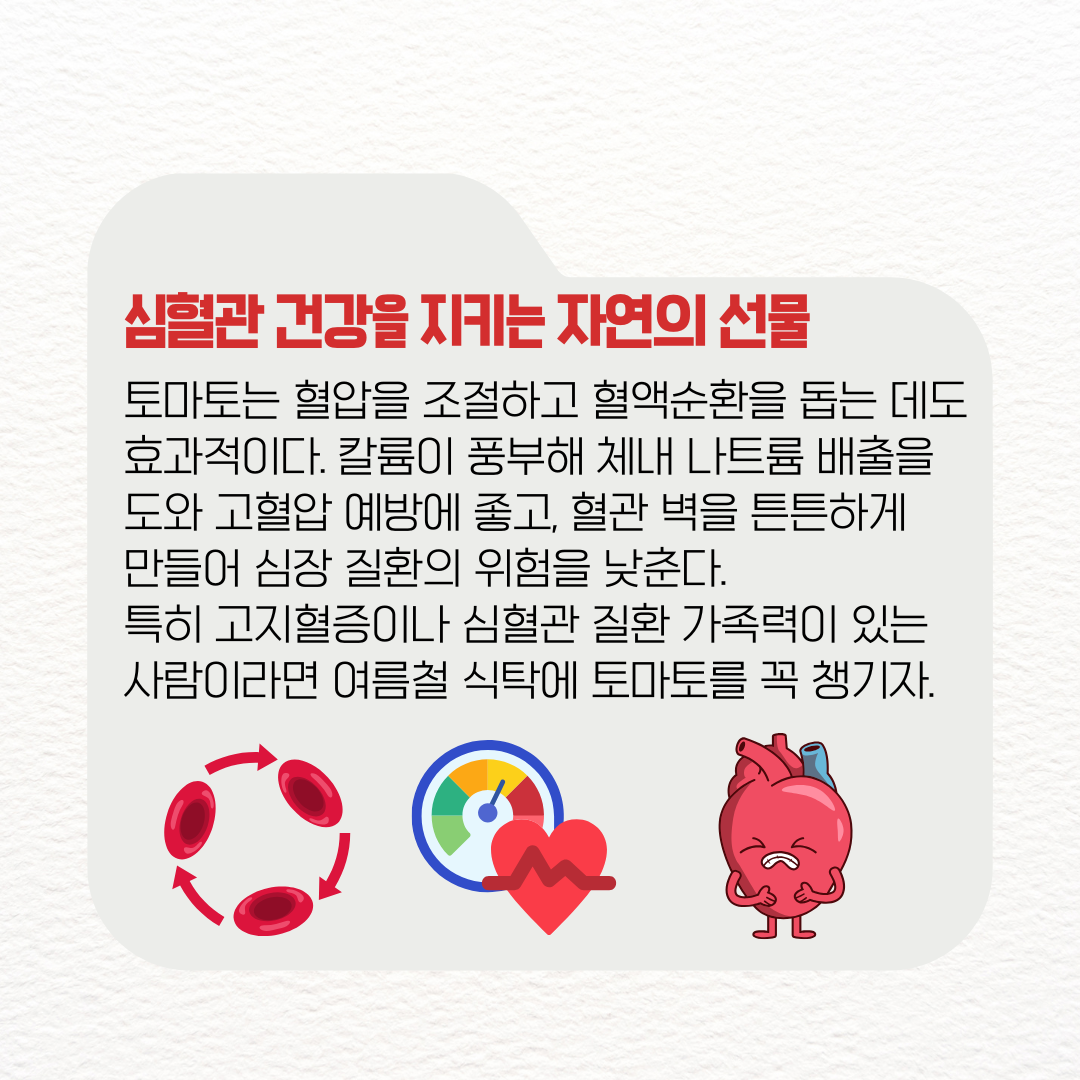 토마토는 심혈관 건강을 지키는 데 매우 뛰어난 식품으로 꼽힌다. 특히 토마토에 풍부하게 함유된 리코펜은 강력한 항산화 작용을 통해 혈관 속 염증을 줄이고, LDL 콜레스테롤(나쁜 콜레스테롤)의 산화를 막아 동맥경화를 예방하는 데 도움을 준다.