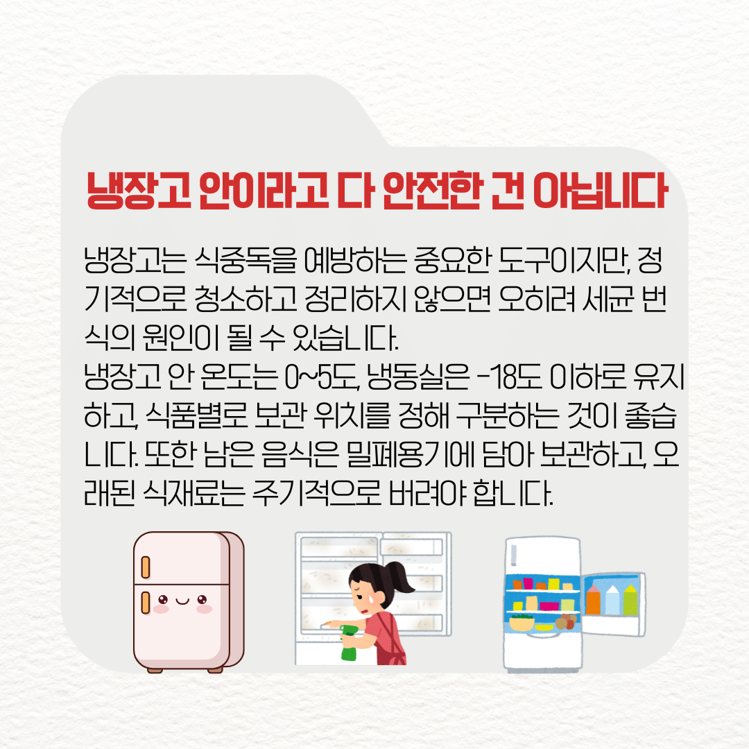냉장고 내부는 최소 월 1회 이상 청소하고, 식재료는 종류별로 구분해 보관하는 것이 세균 오염을 막는 데 효과적입니다.