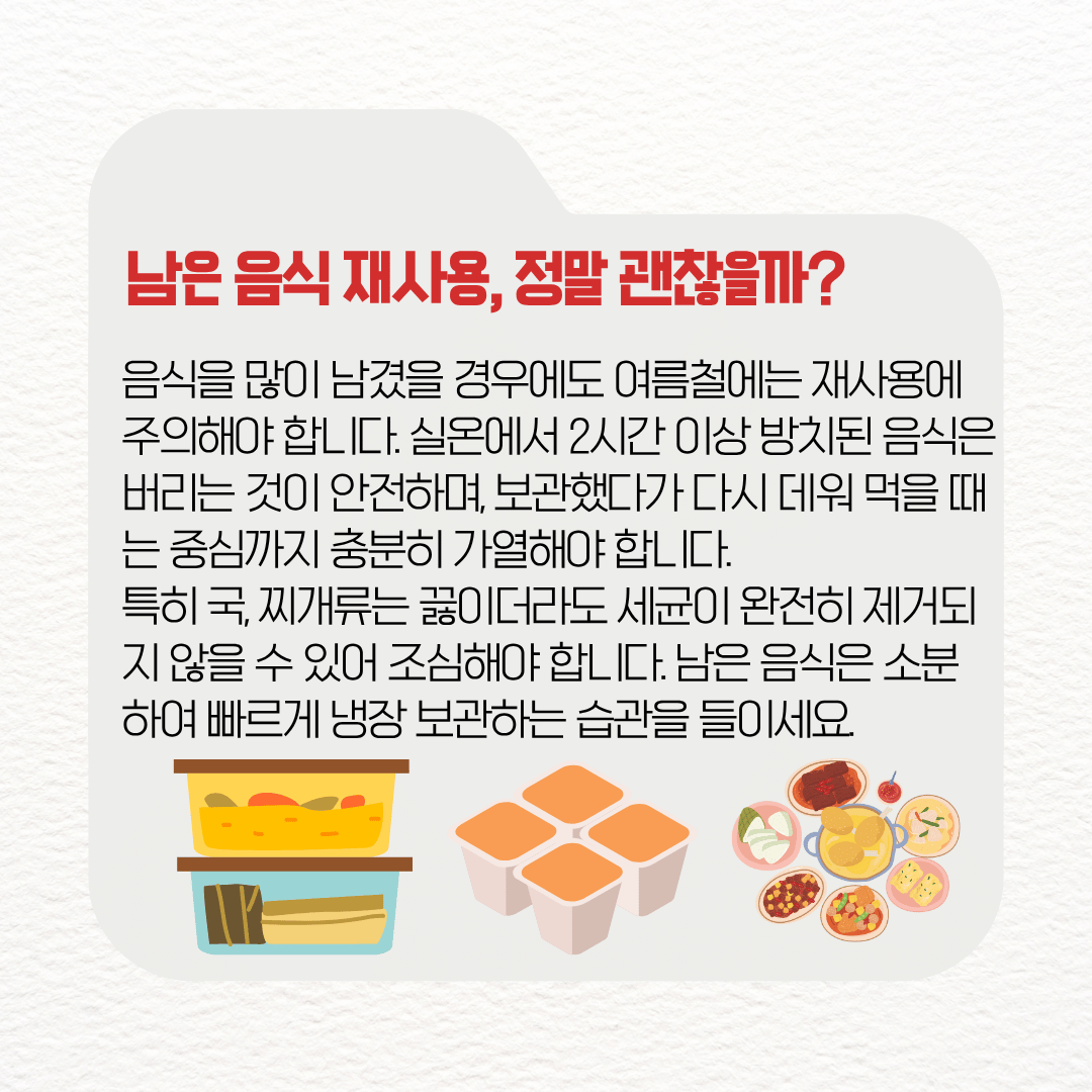 여름철에는 음식물이 쉽게 상하기 때문에 남은 음식을 재사용하는 데에도 각별한 주의가 필요합니다. 상온에서 2시간 이상 방치된 음식은 이미 세균이 번식했을 가능성이 높기 때문에 과감히 버리는 것이 좋습니다.