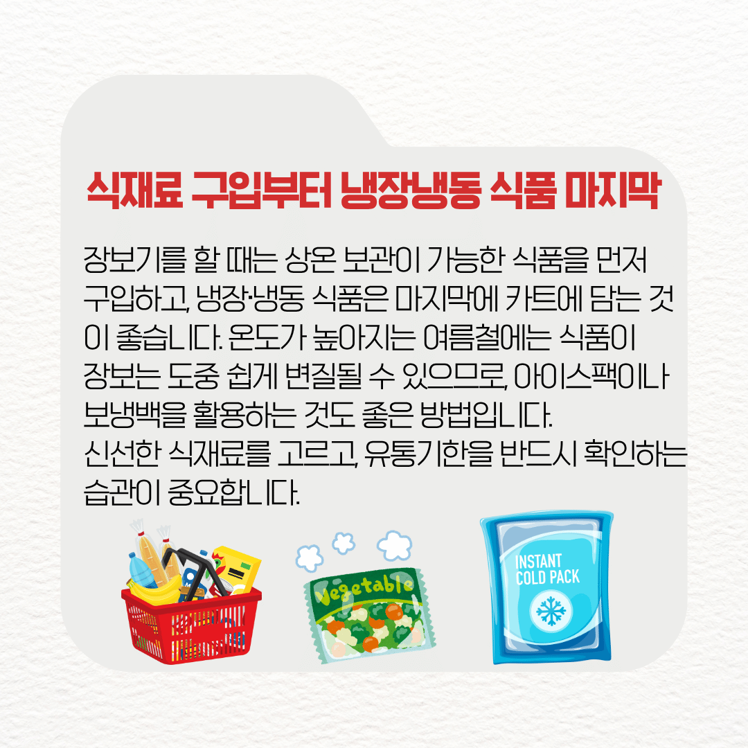 식중독은 조리 단계뿐 아니라 장보기 단계부터 시작될 수 있습니다. 여름철에는 식재료 구입 시 신선도를 반드시 확인해야 하며, 유통기한뿐만 아니라 보관 상태도 살펴보는 것이 중요합니다.