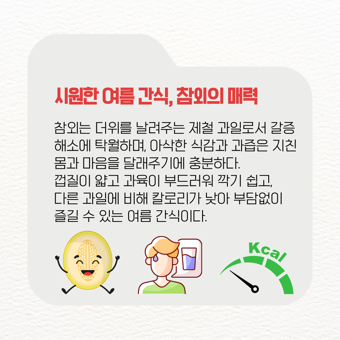 참외는 무더운 여름철, 더위를 날려주는 대표적인 제철 과일로서 수분 함량이 90% 이상으로 갈증 해소에 탁월하며, 자연스러운 단맛 덕분에 아이부터 어른까지 모두 좋아하는 간식으로 사랑받고 있다.