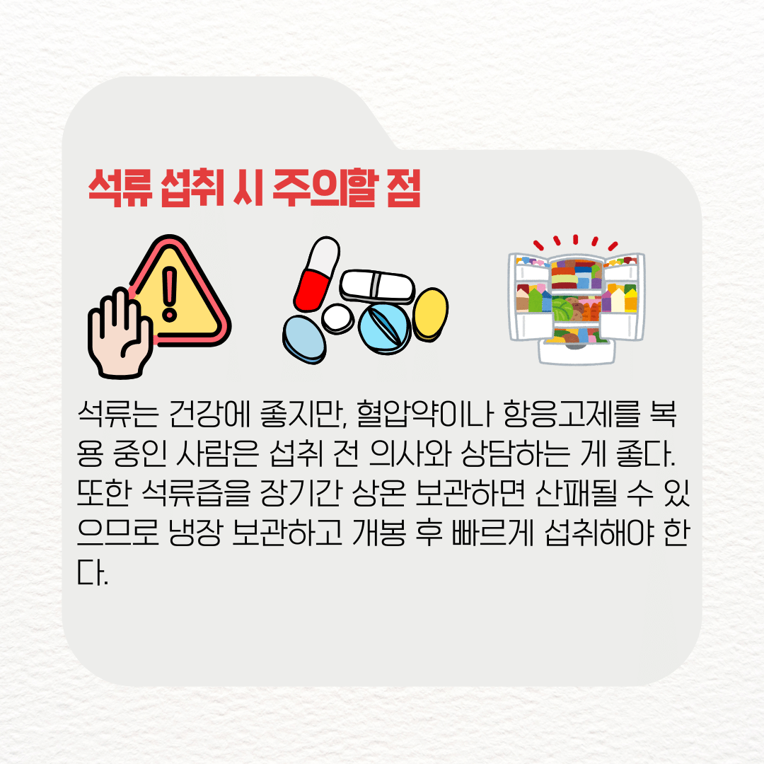 석류는 건강에 좋지만, 혈압약이나 항응고제를 복용 중인 사람은 섭취 전 의사와 상담하는 게 좋다. 또한 석류즙을 장기간 상온 보관하면 산패될 수 있으므로 냉장 보관하고 개봉 후 빠르게 섭취해야 한다.