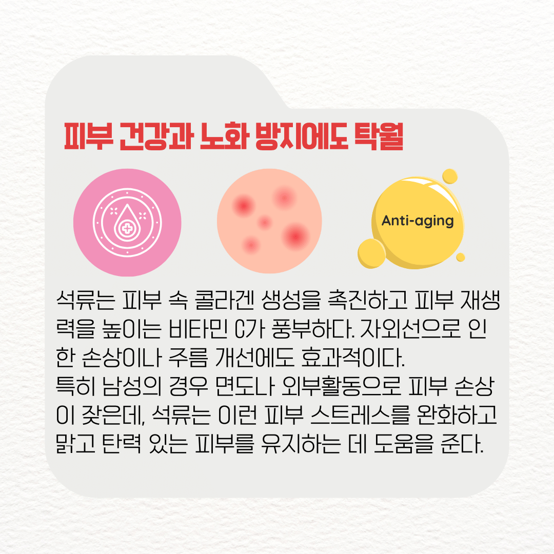 특히 남성의 경우 면도나 외부활동으로 피부 손상이 잦은데, 석류는 이런 피부 스트레스를 완화하고 맑고 탄력 있는 피부를 유지하는 데 도움을 준다.