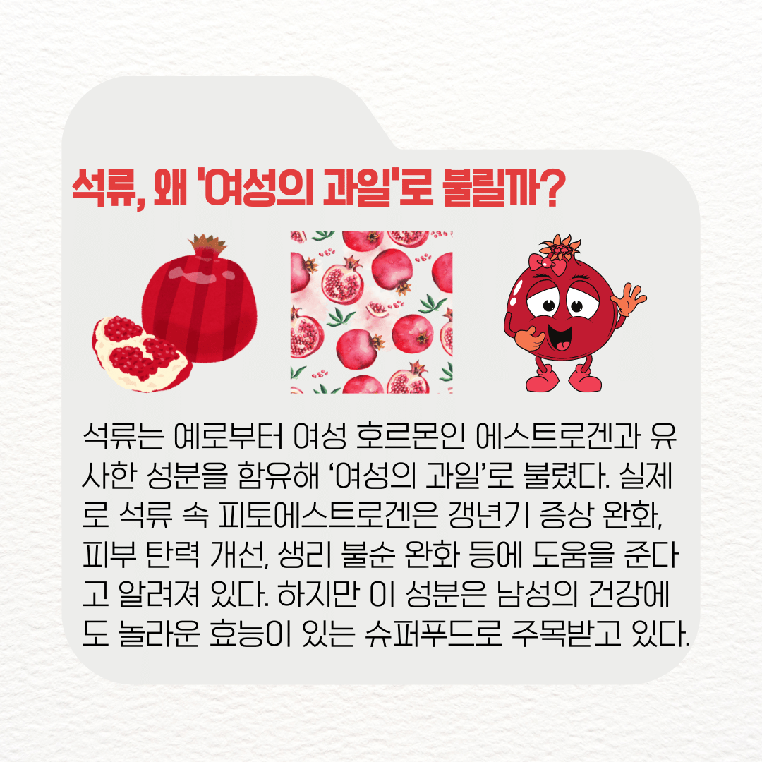 석류는 예로부터 여성 호르몬인 에스트로겐과 유사한 성분을 함유해 ‘여성의 과일’로 불렸다. 실제로 석류 속 피토에스트로겐은 갱년기 증상 완화, 피부 탄력 개선, 생리 불순 완화 등에 도움을 준다고 알려져 있다.