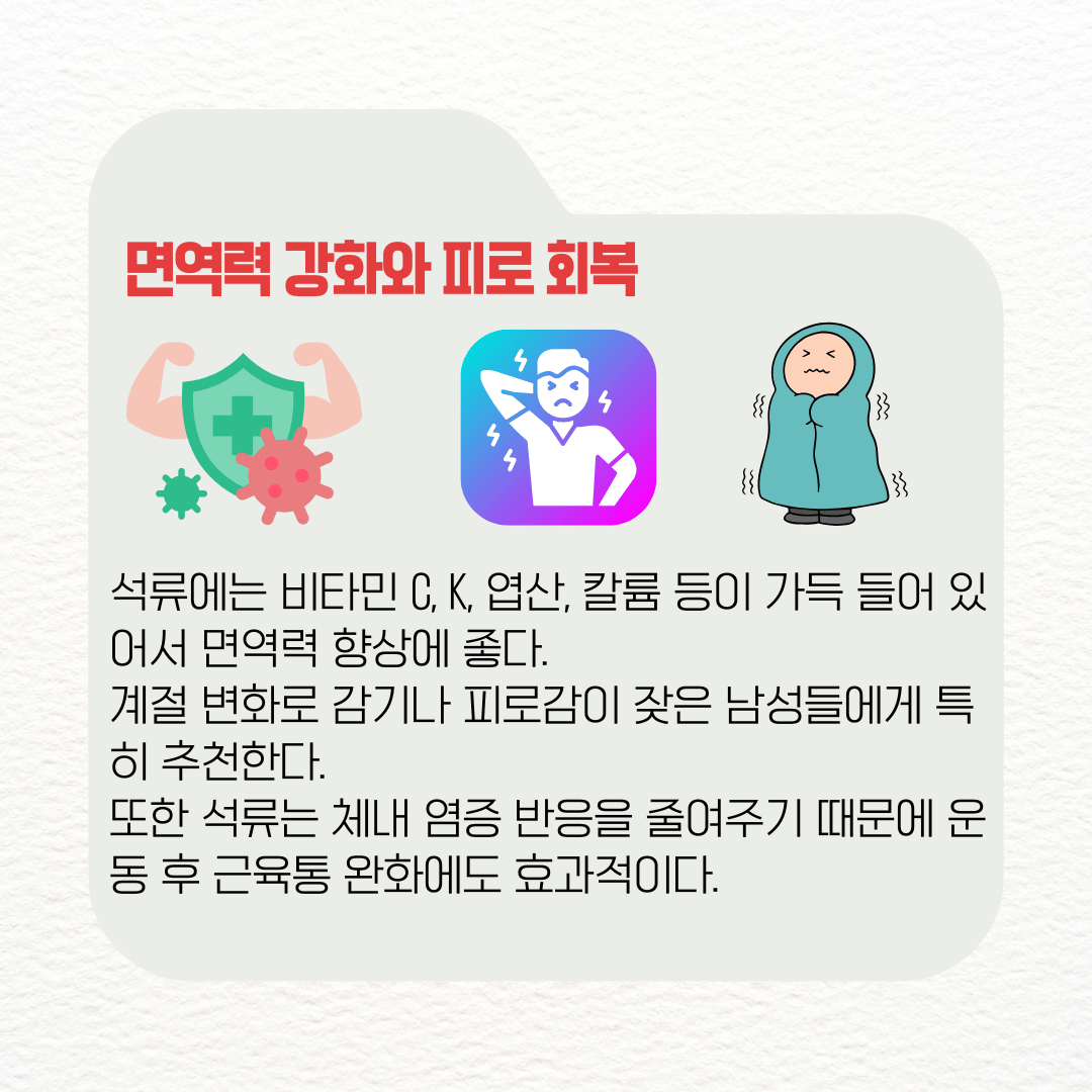 석류에는 비타민 C, K, 엽산, 칼륨 등이 가득 들어 있어서 면역력 향상에 좋다. 계절 변화로 감기나 피로감이 잦은 남성들에게 특히 추천한다. 또한 석류는 체내 염증 반응을 줄여주기 때문에 운동 후 근육통 완화에도 효과적이다.