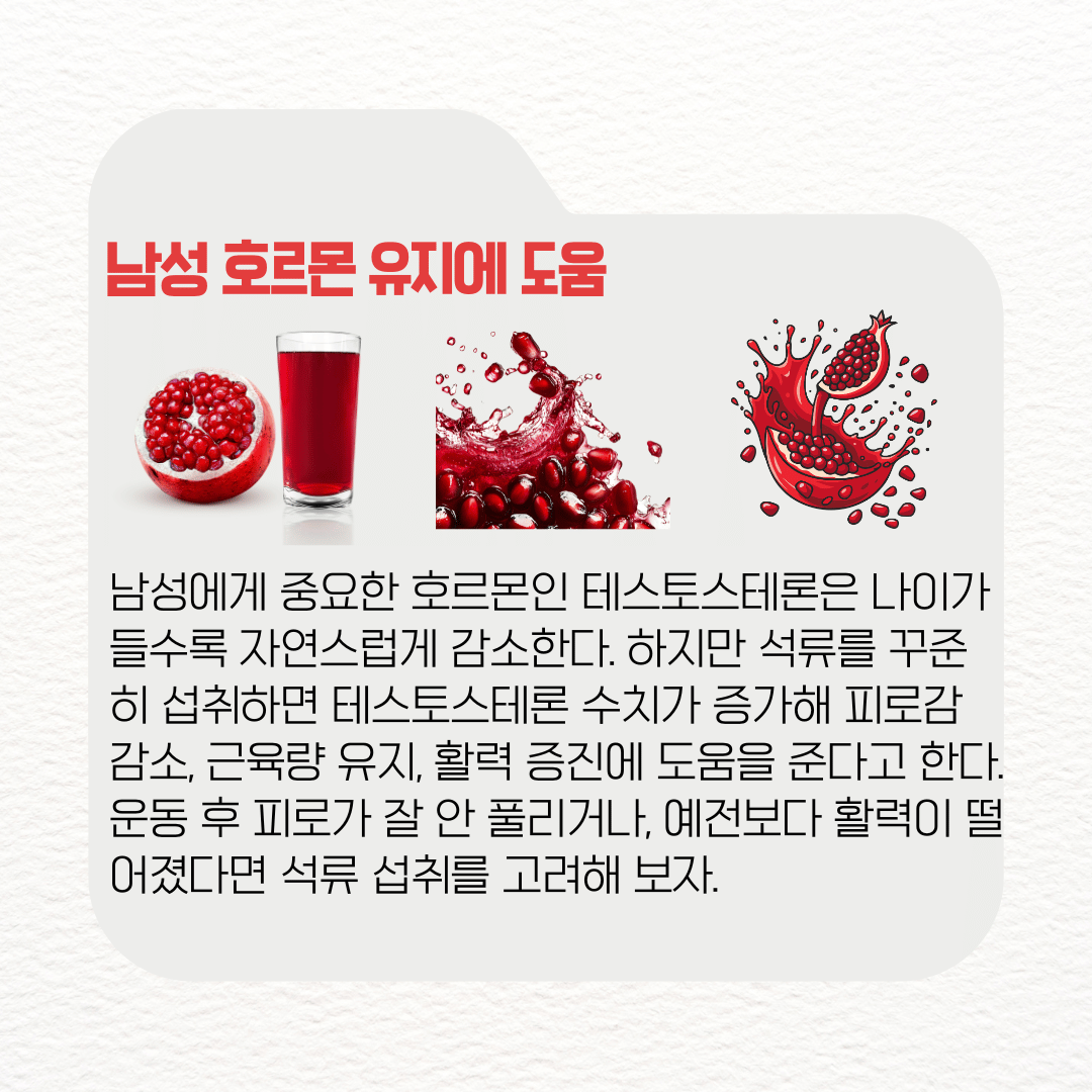 남성에게 중요한 호르몬인 테스토스테론은 나이가 들수록 자연스럽게 감소한다. 하지만 연구에 따르면 석류를 꾸준히 섭취하면 테스토스테론 수치가 증가해 피로감 감소, 근육량 유지, 활력 증진에 도움을 준다고 한다.