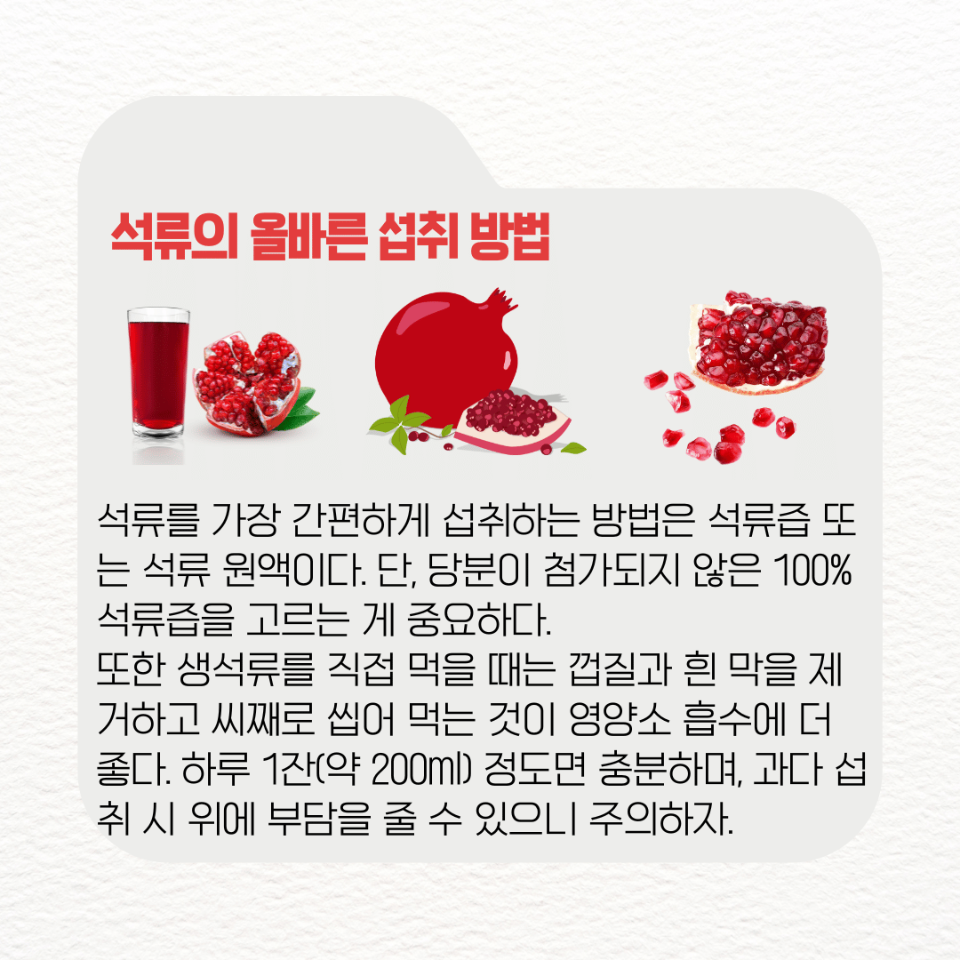 꾸준히 섭취하면 하루의 피로가 덜하고, 활력 넘치는 생활을 유지할 수 있다. 오늘부터 한 잔의 석류로 몸의 균형을 되찾아 보자.