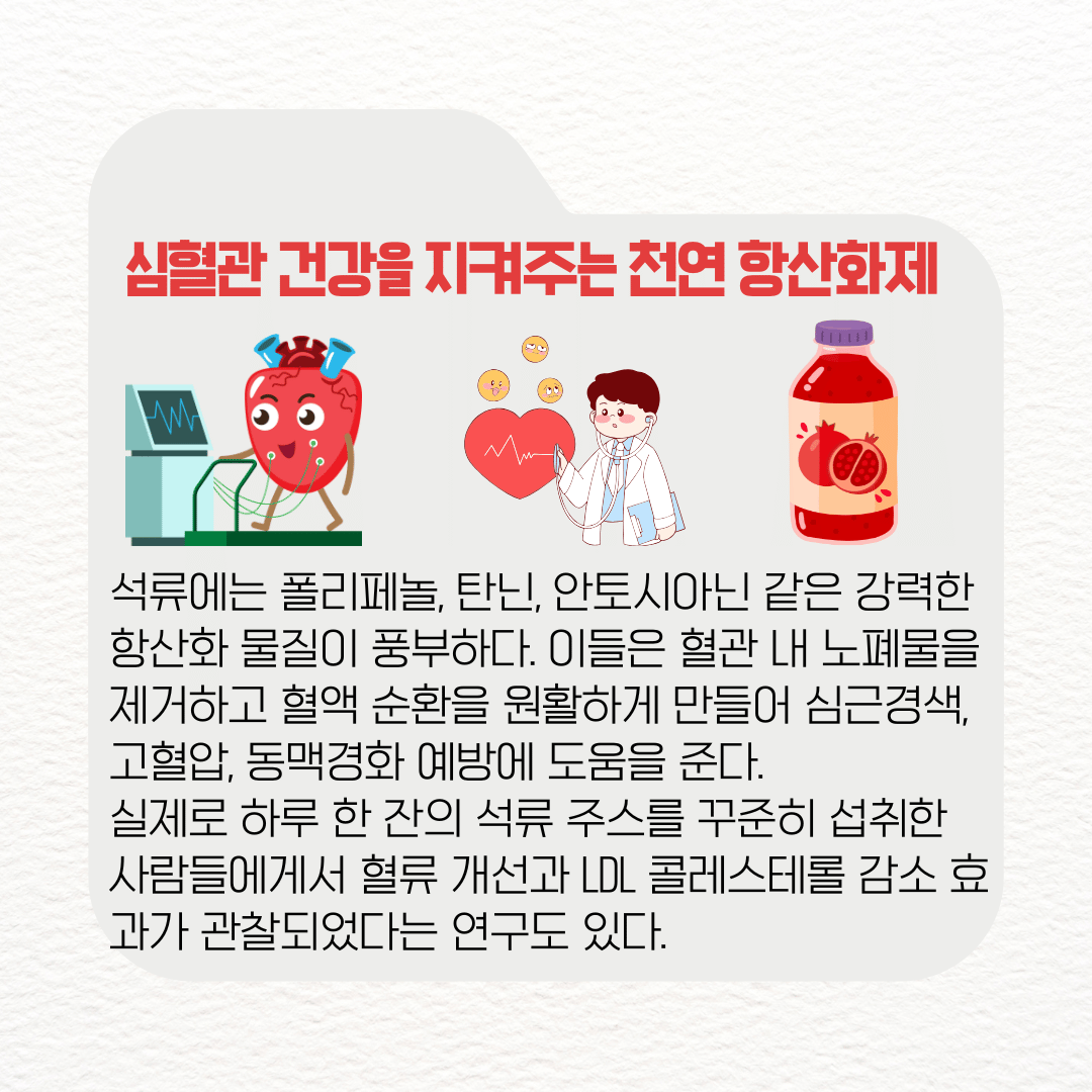 석류에는 폴리페놀, 탄닌, 안토시아닌 같은 강력한 항산화 물질이 풍부하다. 이들은 혈관 내 노폐물을 제거하고 혈액 순환을 원활하게 만들어 심근경색, 고혈압, 동맥경화 예방에 도움을 준다.