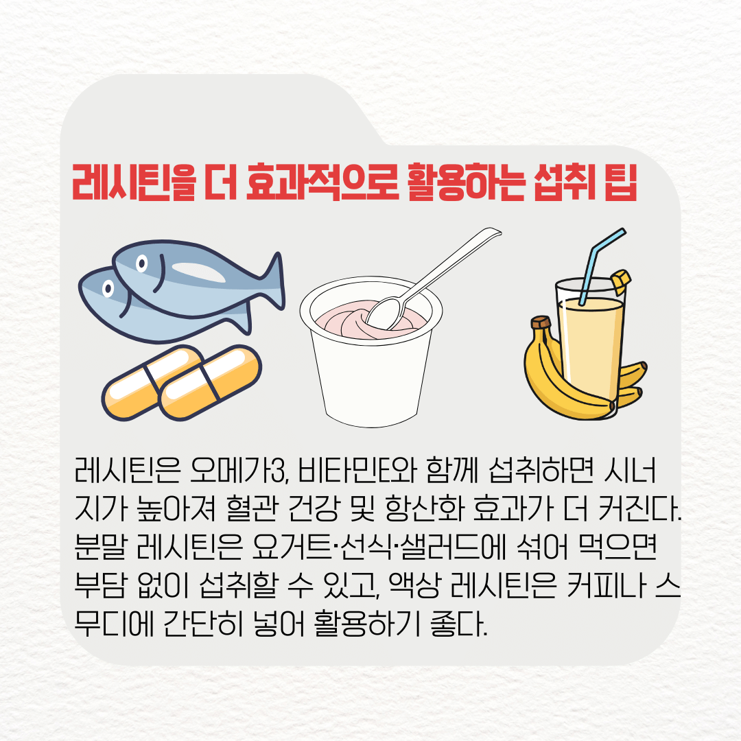 레시틴은 오메가3, 비타민E와 함께 섭취하면 시너지가 높아져 혈관 건강 및 항산화 효과가 더 커진다. 분말 레시틴은 요거트·선식·샐러드에 섞어 먹으면 부담 없이 섭취할 수 있고, 액상 레시틴은 커피나 스무디에 간단히 넣어 활용하기 좋다.