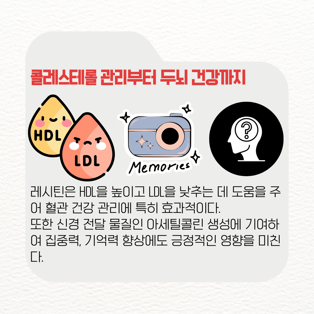 레시틴의 대표 효능: 콜레스테롤 관리부터 두뇌 건강까지